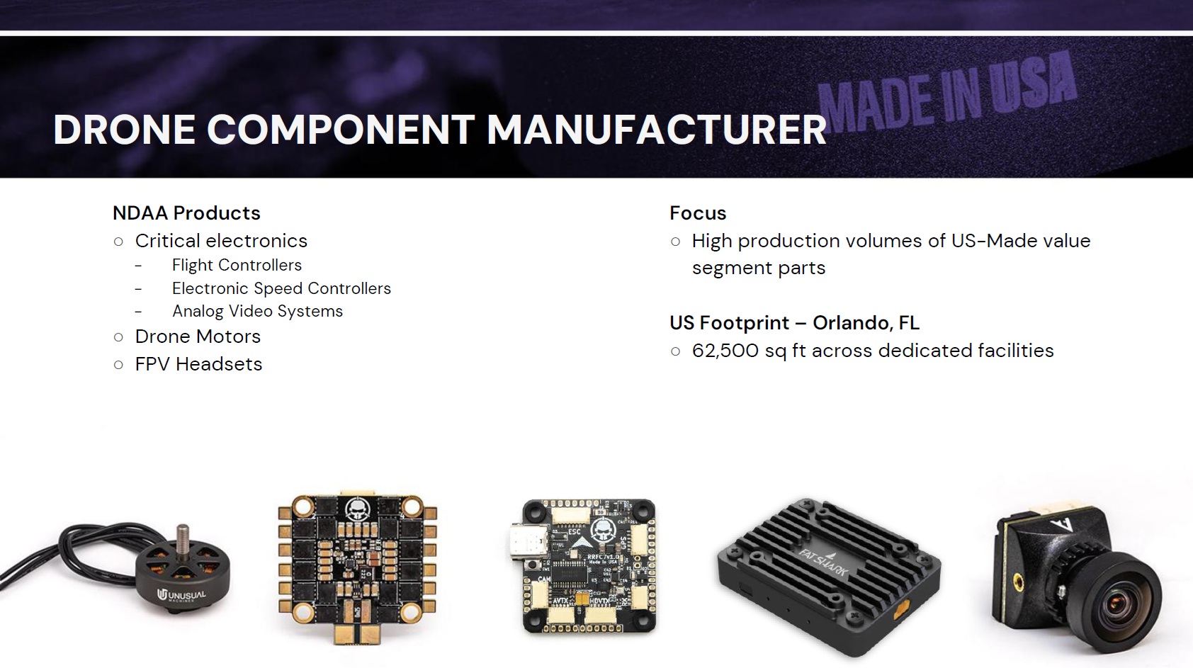 DRONE COMPONENT MANUFACTURER NDAA Products ○ Critical electronics - Flight Controllers - Electronic Speed Controllers - Analog Video Systems ○ Drone Motors ○ FPV Headsets Focus ○ High production volumes of US - Made value segment parts US Footprint – Orlando, FL ○ 62,500 sq ft across dedicated facilities