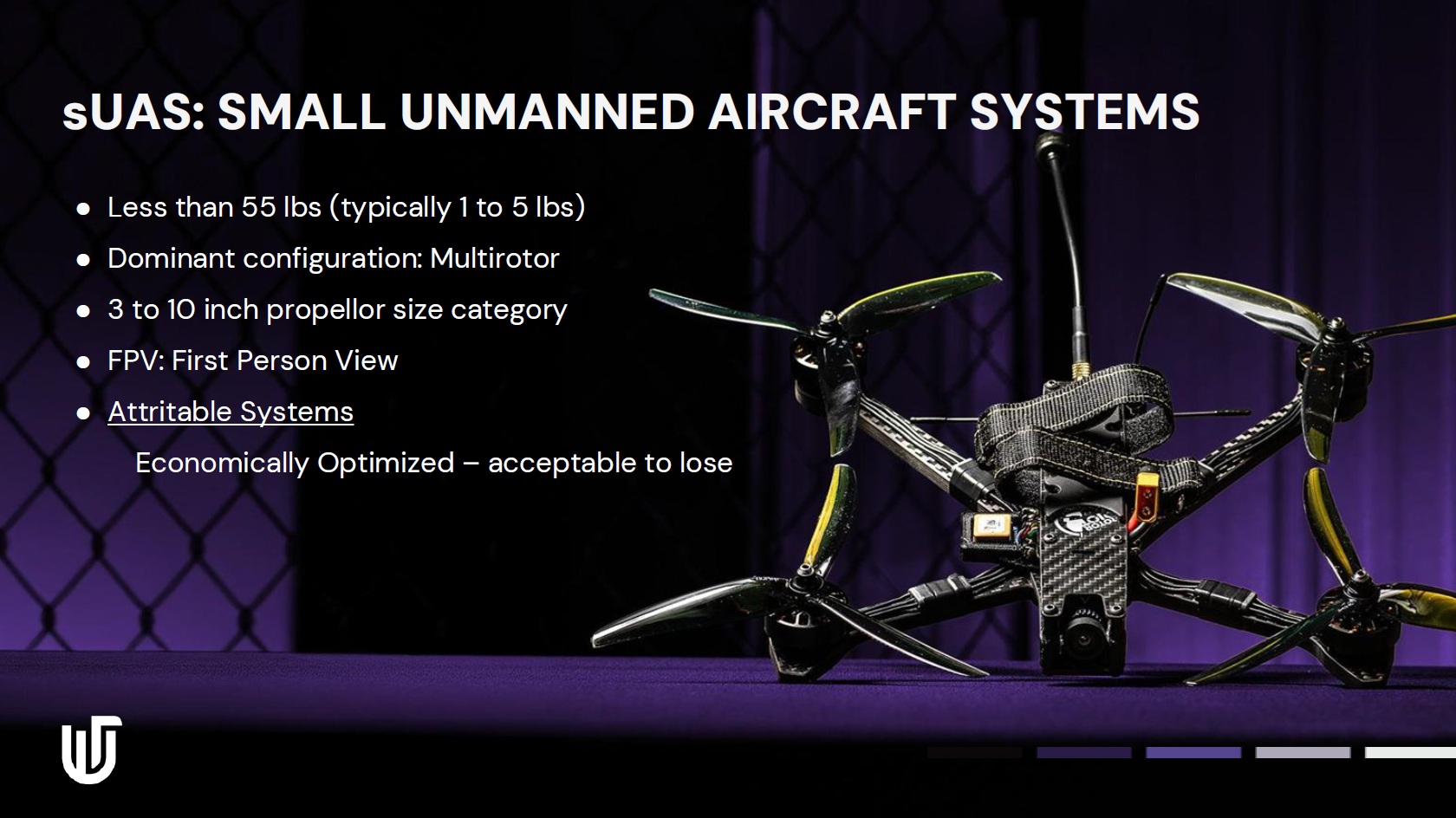 sUAS: SMALL UNMANNED AIRCRAFT SYSTEMS ● Less than 55 lbs (typically 1 to 5 lbs) ● Dominant configuration: Multirotor ● 3 to 10 inch propellor size category ● FPV: First Person View ● Attritable Systems Economically Optimized – acceptable to lose