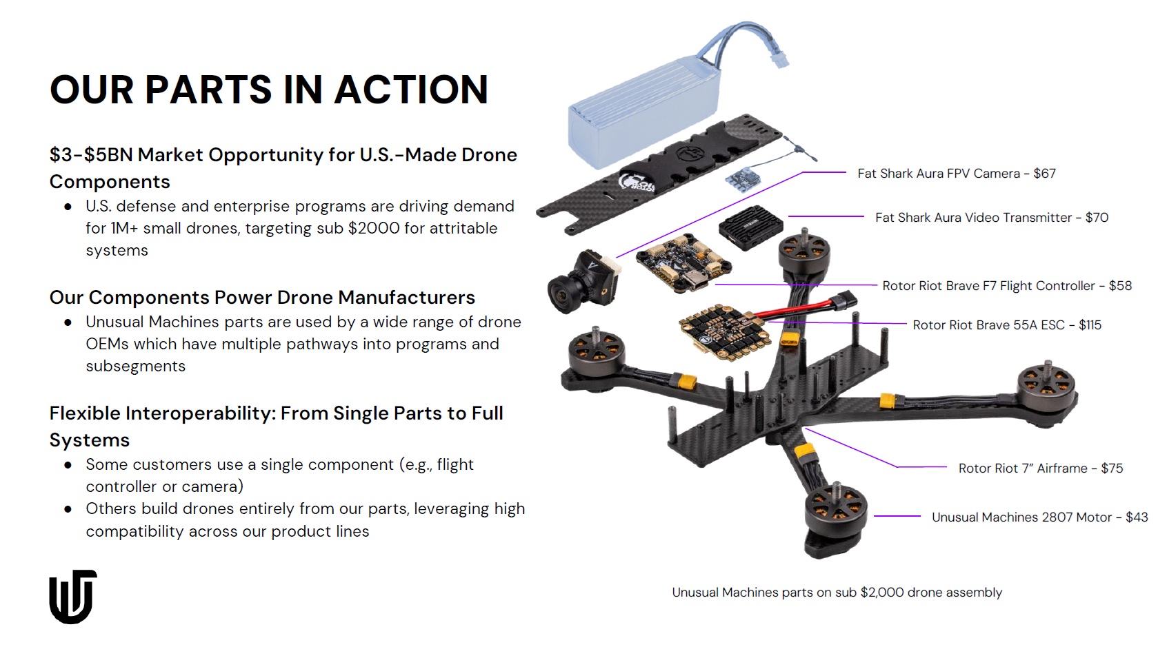 OUR PARTS IN ACTION $3 - $5BN Market Opportunity for U.S. - Made Drone Components ● U.S. defense and enterprise programs are driving demand for 1M+ small drones, targeting sub $2000 for attritable systems Our Components Power Drone Manufacturers ● Unusual Machines parts are used by a wide range of drone OEMs which have multiple pathways into programs and subsegments Flexible Interoperability: From Single Parts to Full Systems ● Some customers use a single component (e.g., flight controller or camera) ● Others build drones entirely from our parts, leveraging high compatibility across our product lines Unusual Machines parts on sub $2,000 drone assembly Fat Shark Aura FPV Camera - $67 Fat Shark Aura Video Transmitter - $70 Rotor Riot Brave F7 Flight Controller - $58 Rotor Riot Brave 55A ESC - $115 Unusual Machines 2807 Motor - $43 Rotor Riot 7” Airframe - $75