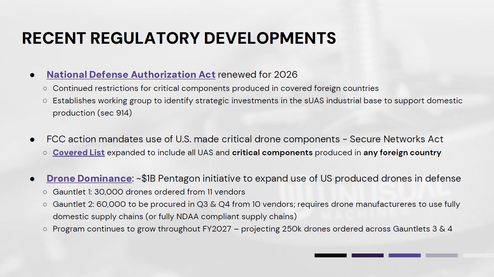 RECENT REGULATORY DEVELOPMENTS ● National Defense Authorization Act renewed for 2026 ○ Continued restrictions for critical components produced in covered foreign countries ○ Establishes working group to identify strategic investments in the sUAS industrial base to support domestic production (sec 914) ● FCC action mandates use of U.S. made critical drone components - Secure Networks Act ○ Covered List expanded to include all UAS and critical components produced in any foreign country ● Drone Dominance : ~$1B Pentagon initiative to expand use of US produced drones in defense ○ Gauntlet 1: 30,000 drones ordered from 11 vendors ○ Gauntlet 2: 60,000 to be procured in Q3 & Q4 from 10 vendors; requires drone manufactureres to use fully domestic supply chains (or fully NDAA compliant supply chains) ○ Program continues to grow throughout FY2027 – projecting 250k drones ordered across Gauntlets 3 & 4