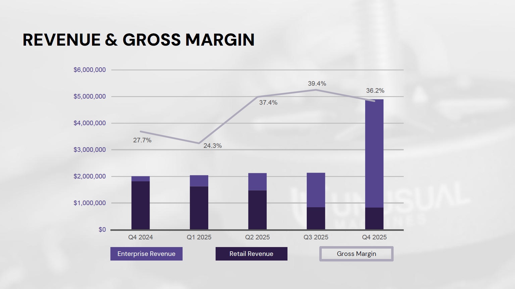 24.3% 37.4% 39.4% 36.2% $2,000,000 $1,000,000 $0 $3,000,000 $4,000,000 27.7% $5,000,000 $6,000,000 Q4 2024 Q1 2025 Q2 2025 Q3 2025 Q4 2025 REVENUE & GROSS MARGIN Enterprise Revenue Retail Revenue Gross Margin