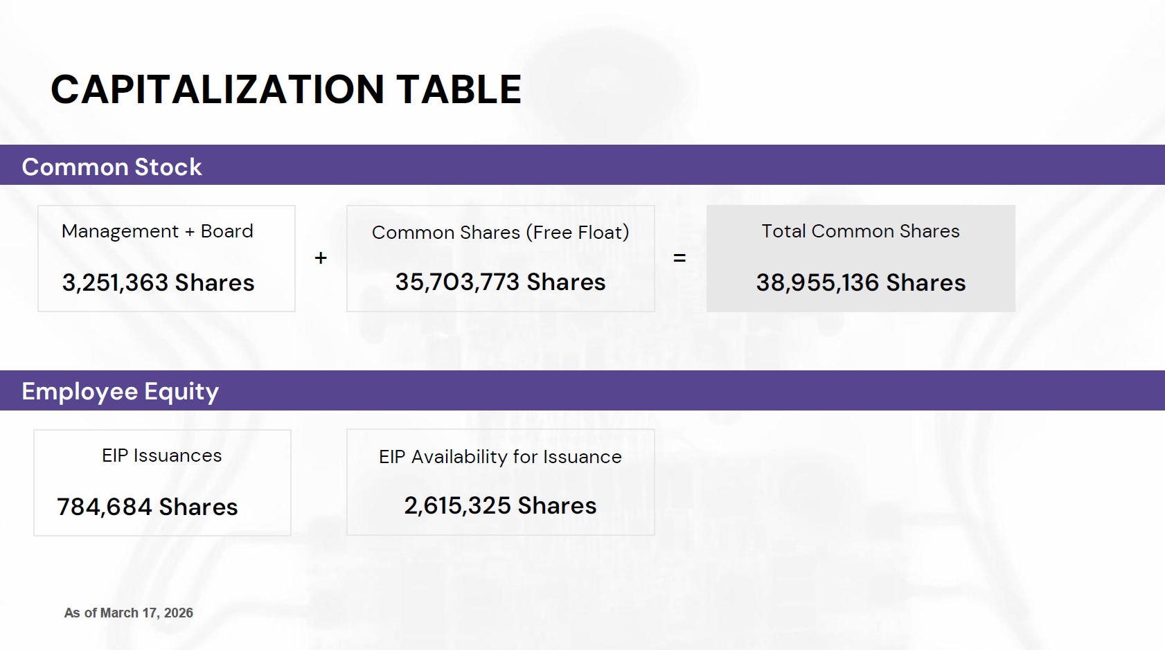 CAPITALIZATION TABLE Common Stock Management + Board 3,251,363 Shares + Common Shares (Free Float) 35,703,773 Shares = Total Common Shares 38,955,136 Shares Employee Equity As of March 17, 2026 EIP Issuances 784,684 Shares EIP Availability for Issuance 2,615,325 Shares