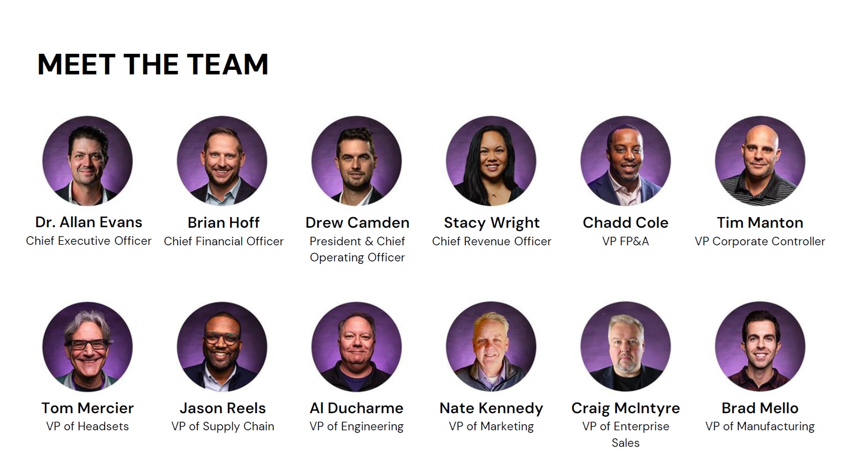 Stacy Wright Chief Revenue Officer MEET THE TEAM Dr. Allan Evans Chief Executive Officer Brian Hoff Chief Financial Officer Drew Camden President & Chief Operating Officer Tom Mercier VP of Headsets Jason Reels VP of Supply Chain Al Ducharme VP of Engineering Nate Kennedy VP of Marketing Craig McIntyre VP of Enterprise Sales Brad Mello VP of Manufacturing Chadd Cole VP FP&A Tim Manton VP Corporate Controller