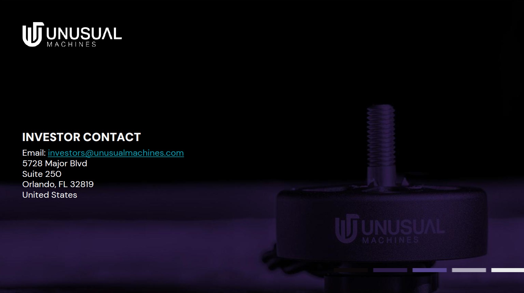 INVESTOR CONTACT Email: investors@unusualmachines.com 5728 Major Blvd Suite 250 Orlando, FL 32819 United States