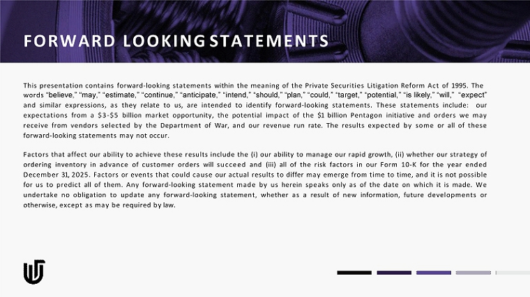 FORWARD LOOKING STATEMENTS This presentation contains forward - looking statements within the meaning of the Private Securities Litigation Reform Act of 1995 . The words “believe,” “may,” “estimate,” “continue,” “anticipate,” “intend,” “should,” “plan,” “could,” “target,” “potential,” “is likely,” “will,” “expect” and similar expressions, as they relate to us, are intended to identify forward - looking statements . These statements include : our expectations from a $ 3 - $ 5 billion market opportunity, the potential impact of the $ 1 billion Pentagon initiative and orders we may receive from vendors selected by the Department of War, and our revenue run rate . The results expected by some or all of these forward - looking statements may not occur . Factors that affect our ability to achieve these results include the (i) our ability to manage our rapid growth, (ii) whether our strategy of ordering inventory in advance of customer orders will succeed and (iii) all of the risk factors in our Form 10 - K for the year ended December 31 , 2025 . Factors or events that could cause our actual results to differ may emerge from time to time, and it is not possible for us to predict all of them . Any forward - looking statement made by us herein speaks only as of the date on which it is made . We undertake no obligation to update any forward - looking statement, whether as a result of new information, future developments or otherwise, except as may be required by law .