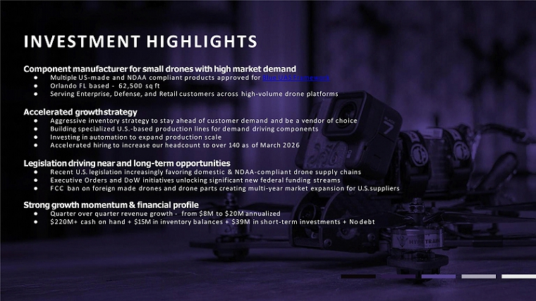 INVESTMENT HIGHLIGHTS Component manufacturer for small drones with high market demand ● Multiple US - made and NDAA compliant products approved for Blue UAS Framework ● Orlando FL based - 62,500 sq ft ● Serving Enterprise, Defense, and Retail customers across high - volume drone platforms Accelerated growth strategy ● Aggressive inventory strategy to stay ahead of customer demand and be a vendor of choice ● Building specialized U.S. - based production lines for demand driving components ● Investing in automation to expand production scale ● Accelerated hiring to increase our headcount to over 140 as of March 2026 Legislation driving near and long - term opportunities ● Recent U.S. legislation increasingly favoring domestic & NDAA - compliant drone supply chains ● Executive Orders and DoW initiatives unlocking significant new federal funding streams ● FCC ban on foreign made drones and drone parts creating multi - year market expansion for U.S. suppliers Strong growth momentum & financial profile ● Quarter over quarter revenue growth - from $8M to $20M annualized ● $220M+ cash on hand + $15M in inventory balances + $39M in short - term investments + No debt