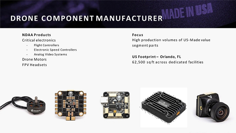 DRONE COMPONENT MANUFACTURER NDAA Products Critical electronics - Flight Controllers - Electronic Speed Controllers - Analog Video Systems Drone Motors FPV Headsets Focus High production volumes of US - Made value segment parts US Footprint – Orlando, FL 62,500 sq ft across dedicated facilities