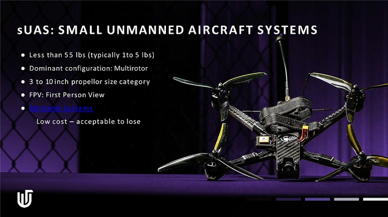 sUAS: SMALL UNMANNED AIRCRAFT SYSTEMS ● Less than 55 lbs (typically 1 to 5 lbs) ● Dominant configuration: Multirotor ● 3 to 10 inch propellor size category ● FPV: First Person View ● Attritable Systems Low cost – acceptable to lose