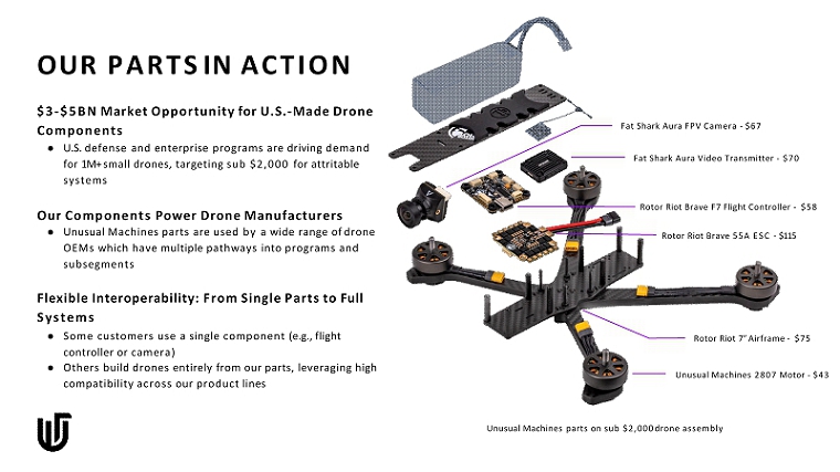OUR PARTS IN ACTION $3 - $5BN Market Opportunity for U.S. - Made Drone Components ● U.S. defense and enterprise programs are driving demand for 1M+ small drones, targeting sub $2,000 for attritable systems Our Components Power Drone Manufacturers ● Unusual Machines parts are used by a wide range of drone OEMs which have multiple pathways into programs and subsegments Flexible Interoperability: From Single Parts to Full Systems ● Some customers use a single component (e.g., flight controller or camera) ● Others build drones entirely from our parts, leveraging high compatibility across our product lines Unusual Machines parts on sub $2,000 drone assembly Fat Shark Aura FPV Camera - $67 Fat Shark Aura Video Transmitter - $70 Rotor Riot Brave F7 Flight Controller - $58 Rotor Riot Brave 55A ESC - $115 Rotor Riot 7” Airframe - $75 Unusual Machines 2807 Motor - $43