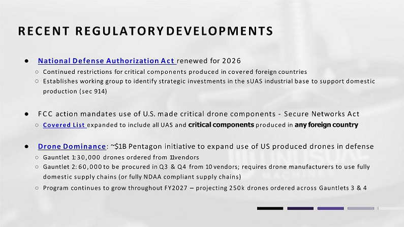 RECENT REGULATORY DEVELOPMENTS ● National Defense Authorization Act renewed for 2026 ○ Continued restrictions for critical components produced in covered foreign countries ○ Establishes working group to identify strategic investments in the sUAS industrial base to support domestic production (sec 914) ● FCC action mandates use of U.S. made critical drone components - Secure Networks Act ○ Covered List expanded to include all UAS and critical components produced in any foreign country ● Drone Dominance : ~$1B Pentagon initiative to expand use of US produced drones in defense ○ Gauntlet 1: 30,000 drones ordered from 11 vendors ○ Gauntlet 2: 60,000 to be procured in Q3 & Q4 from 10 vendors; requires drone manufacturers to use fully domestic supply chains (or fully NDAA compliant supply chains) ○ Program continues to grow throughout FY2027 – projecting 250k drones ordered across Gauntlets 3 & 4