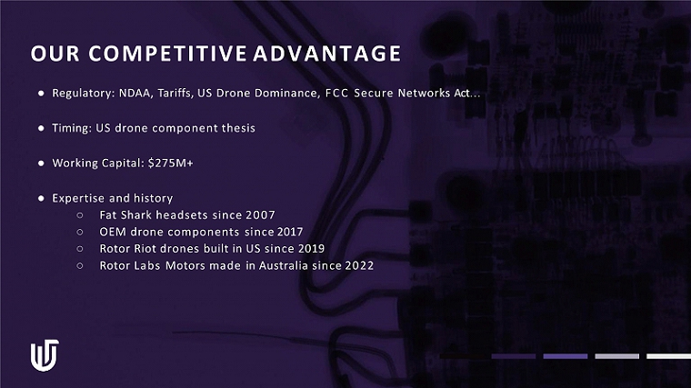 OUR COMPETITIVE ADVANTAGE ● Regulatory: NDAA, Tariffs, US Drone Dominance, FCC Secure Networks Act … ● Timing: US drone component thesis ● Working Capital: $275M+ ● Expertise and history ○ Fat Shark headsets since 2007 ○ OEM drone components since 2017 ○ Rotor Riot drones built in US since 2019 ○ Rotor Labs Motors made in Australia since 2022