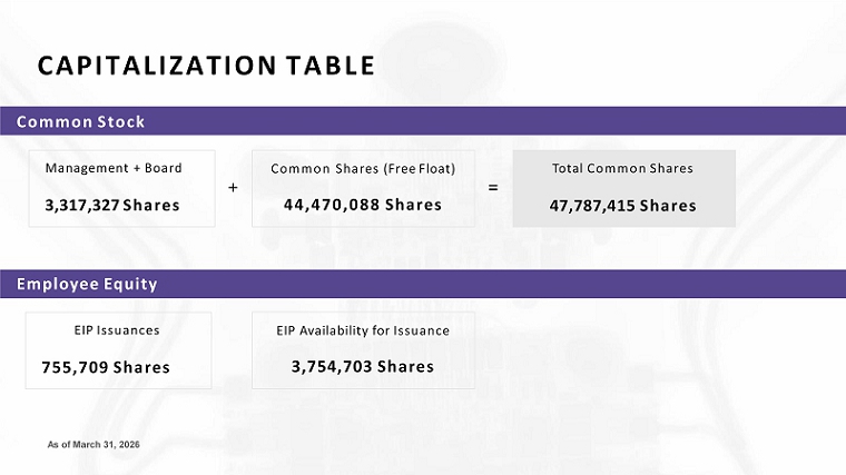 CAPITALIZATION TABLE Common Stock Management + Board 3,317,327 Shares + Common Shares (Free Float) 44,470,088 Shares = Total Common Shares 47,787,415 Shares Employee Equity As of March 31, 2026 EIP Issuances 755,709 Shares EIP Availability for Issuance 3,754,703 Shares