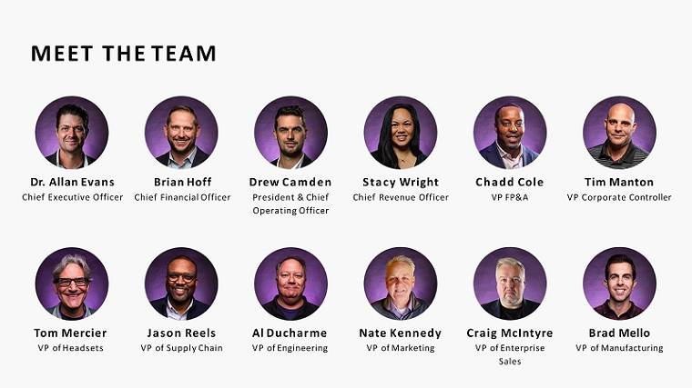 Stacy Wright Chief Revenue Officer MEET THE TEAM Dr. Allan Evans Chief Executive Officer Brian Hoff Chief Financial Officer Drew Camden President & Chief Operating Officer Tom Mercier VP of Headsets Jason Reels VP of Supply Chain Al Ducharme VP of Engineering Nate Kennedy VP of Marketing Craig McIntyre VP of Enterprise Sales Brad Mello VP of Manufacturing Chadd Cole VP FP&A Tim Manton VP Corporate Controller