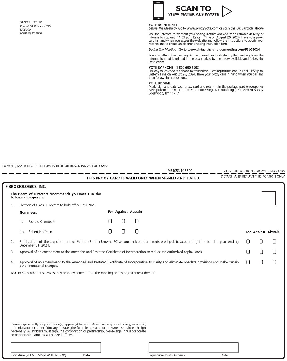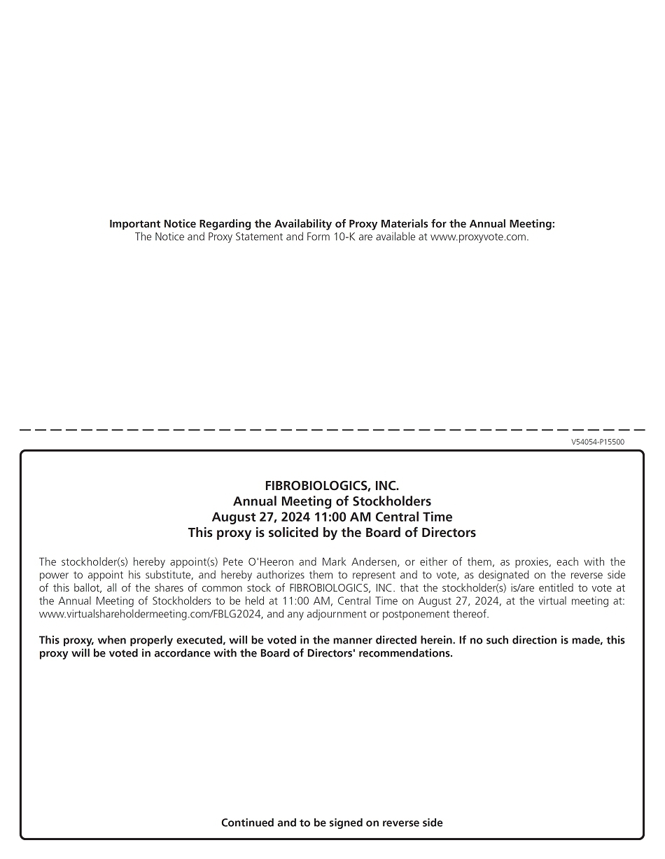 You are cordially invited to attend the Annual Meeting of Stockholders of FIBROBIOLOGICS, INC., a Delaware corporation, or the Annual Meeting. The meeting will be held on Tuesday, August 27, 2024 at 11:00 a.m. Central Time virtually via the Internet at www.virtualshareholdermeeting.com/FBLG2024, originating from Houston, Texas. You will not be able to attend the Annual Meeting in person. At the Annual Meeting, you will be asked to consider and vote upon the following proposals: