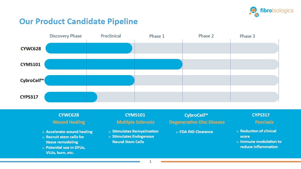 We are a clinical-stage biotechnology company focused on developing and commercializing fibroblast-based therapies for patients suffering from chronic diseases with significant unmet medical needs, including wound healing, multiple sclerosis (MS), degenerative disc disease, psoriasis and certain cancers, and potential human longevity applications including thymic involution reversal. At present, our novel manufacturing process entails collecting excess tissue from surgical procedures and using the allogeneic fibroblasts to grow a cell bank for use in our procedures. Our most advanced product candidates are CYWC628, CYMS101 and CybroCell™.