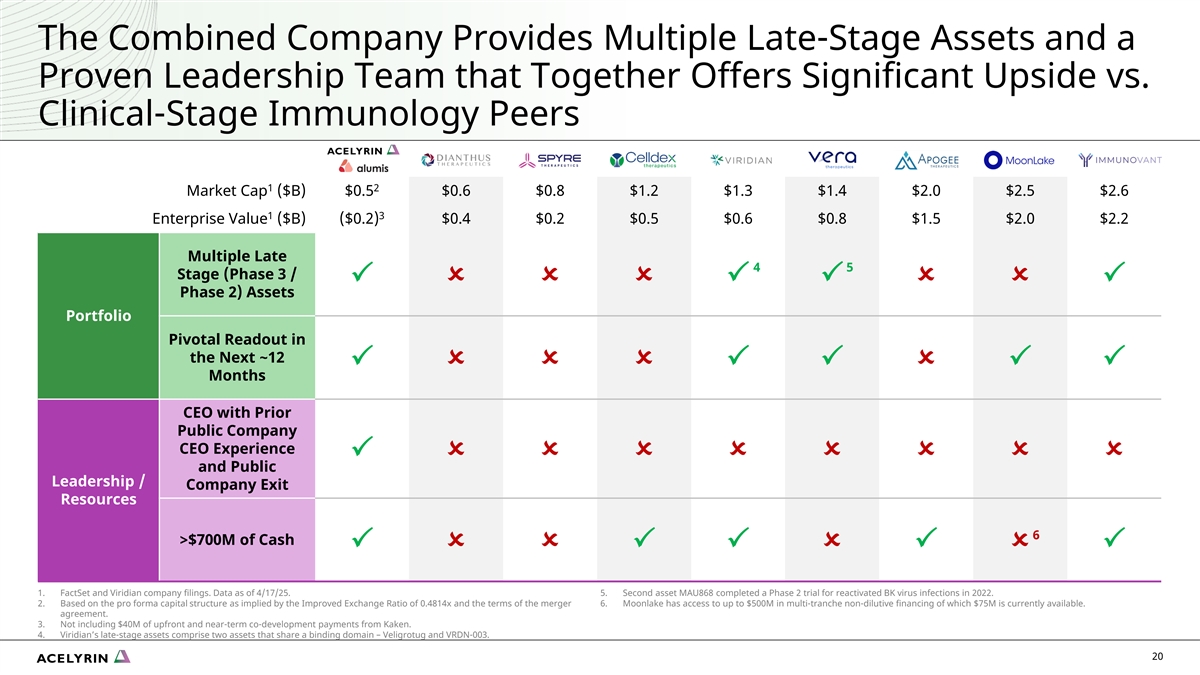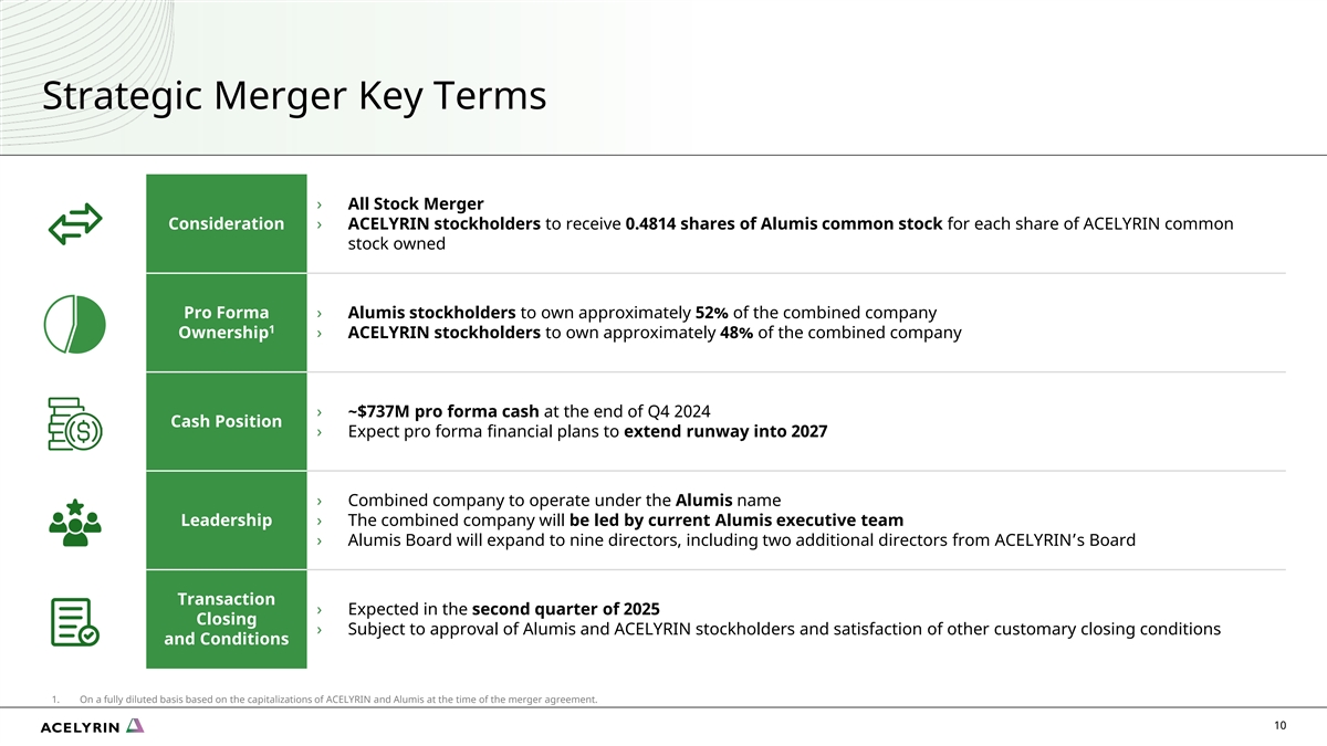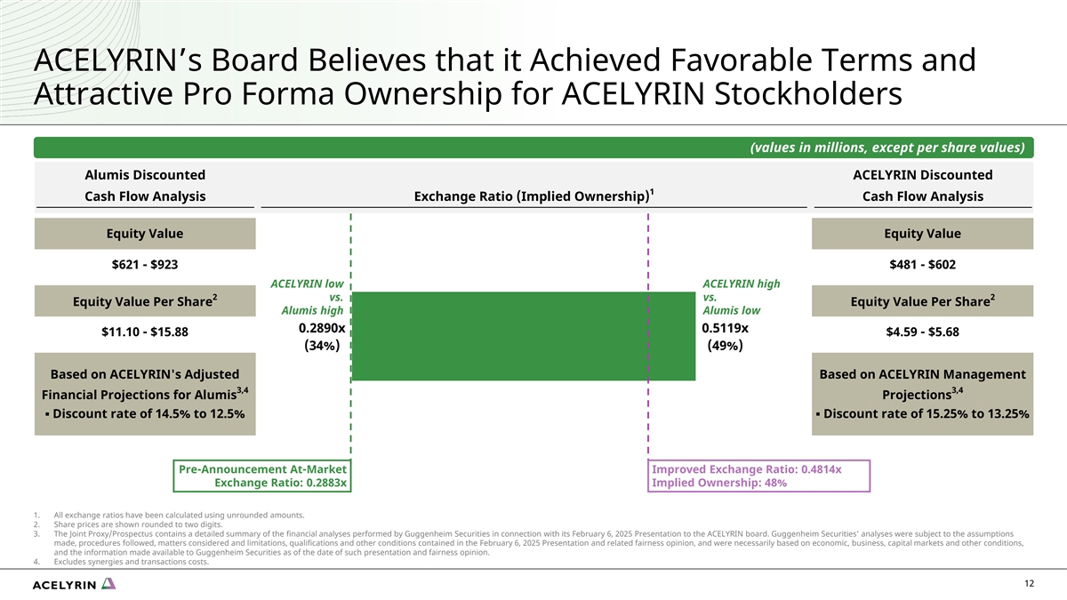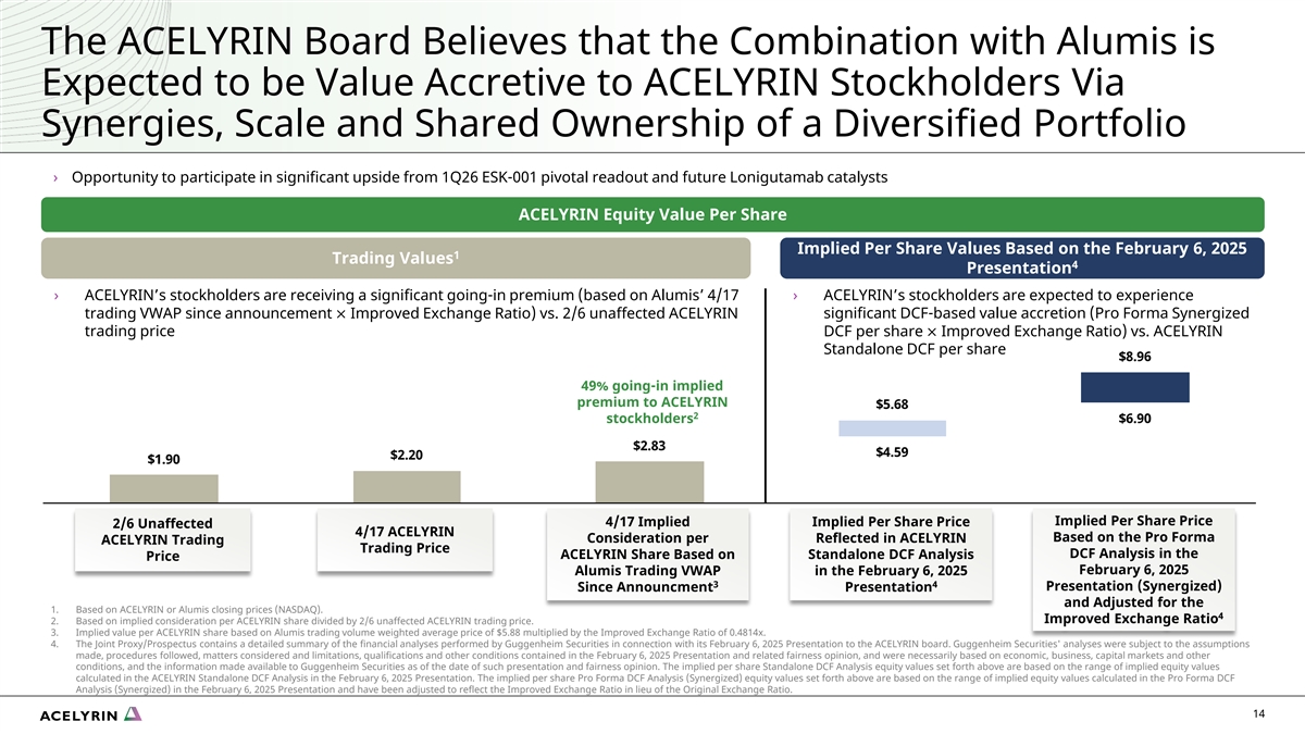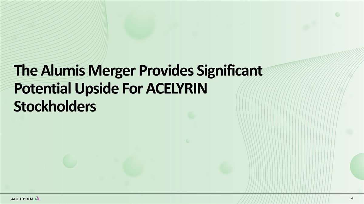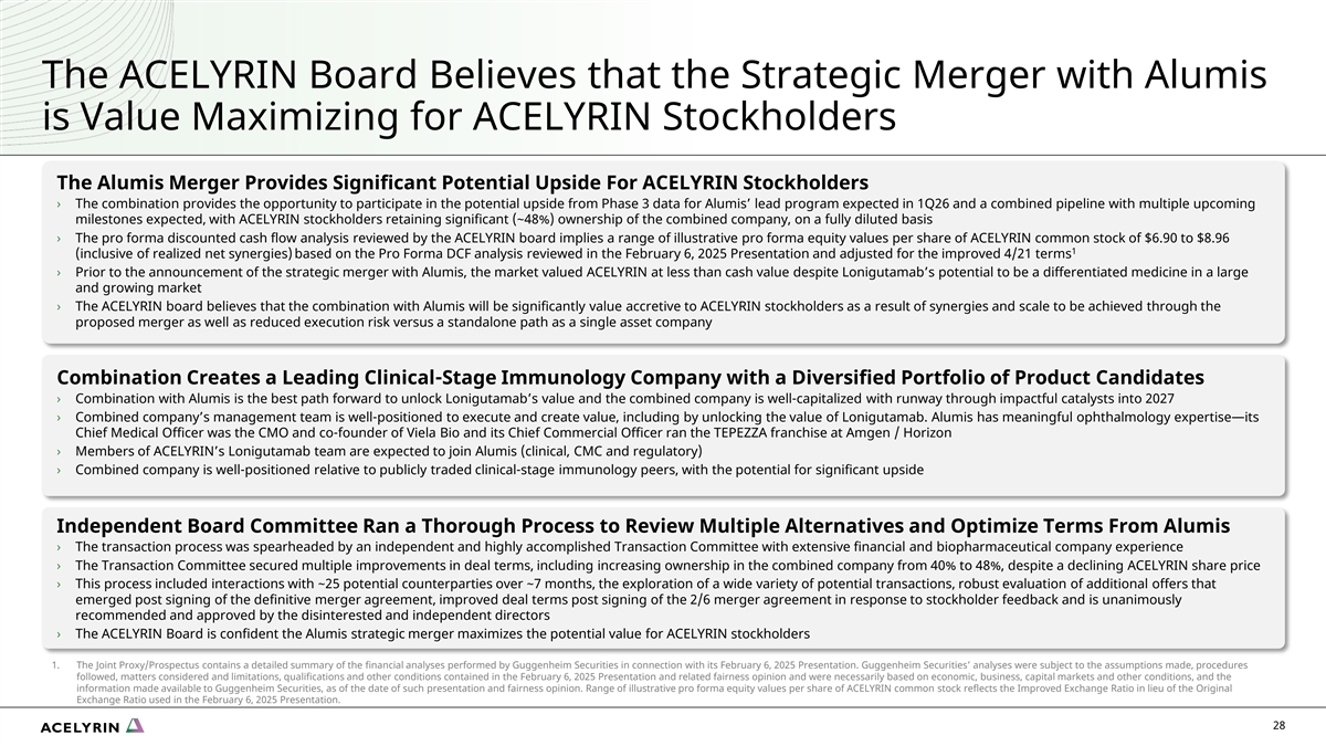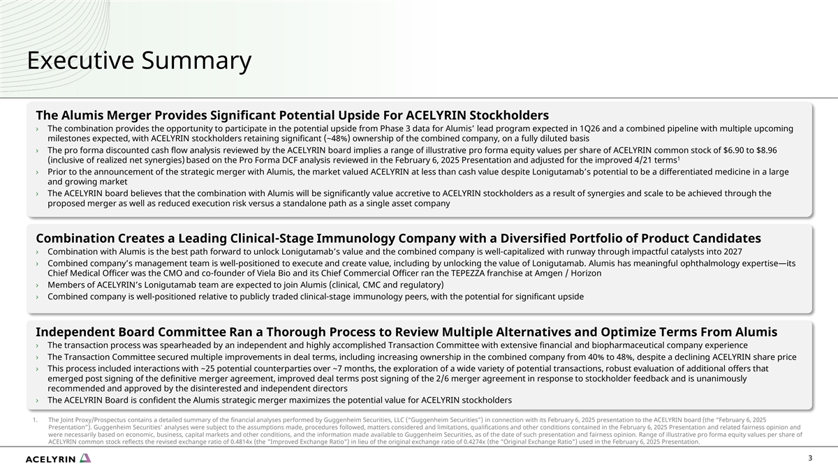 Executive Summary The Alumis Merger Provides Significant Potential Upside For ACELYRIN Stockholders › The combination provides the opportunity to participate in the potential upside from Phase 3 data for Alumis’ lead program expected in 1Q26 and a combined pipeline with multiple upcoming milestones expected, with ACELYRIN stockholders retaining significant (~48%) ownership of the combined company, on a fully diluted basis › The pro forma discounted cash flow analysis reviewed by the ACELYRIN board implies a range of illustrative pro forma equity values per share of ACELYRIN common stock of $6.90 to $8.96 1 (inclusive of realized net synergies) based on the Pro Forma DCF analysis reviewed in the February 6, 2025 Presentation and adjusted for the improved 4/21 terms › Prior to the announcement of the strategic merger with Alumis, the market valued ACELYRIN at less than cash value despite Lonigutamab’s potential to be a differentiated medicine in a large and growing market › The ACELYRIN board believes that the combination with Alumis will be significantly value accretive to ACELYRIN stockholders as a result of synergies and scale to be achieved through the proposed merger as well as reduced execution risk versus a standalone path as a single asset company Combination Creates a Leading Clinical-Stage Immunology Company with a Diversified Portfolio of Product Candidates › Combination with Alumis is the best path forward to unlock Lonigutamab’s value and the combined company is well-capitalized with runway through impactful catalysts into 2027 › Combined company’s management team is well-positioned to execute and create value, including by unlocking the value of Lonigutamab. Alumis has meaningful ophthalmology expertise—its Chief Medical Officer was the CMO and co-founder of Viela Bio and its Chief Commercial Officer ran the TEPEZZA franchise at Amgen / Horizon › Members of ACELYRIN’s Lonigutamab team are expected to join Alumis (clinical, CMC and regulatory) › Combined company is well-positioned relative to publicly traded clinical-stage immunology peers, with the potential for significant upside Independent Board Committee Ran a Thorough Process to Review Multiple Alternatives and Optimize Terms From Alumis › The transaction process was spearheaded by an independent and highly accomplished Transaction Committee with extensive financial and biopharmaceutical company experience › The Transaction Committee secured multiple improvements in deal terms, including increasing ownership in the combined company from 40% to 48%, despite a declining ACELYRIN share price › This process included interactions with ~25 potential counterparties over ~7 months, the exploration of a wide variety of potential transactions, robust evaluation of additional offers that emerged post signing of the definitive merger agreement, improved deal terms post signing of the 2/6 merger agreement in response to stockholder feedback and is unanimously recommended and approved by the disinterested and independent directors › The ACELYRIN Board is confident the Alumis strategic merger maximizes the potential value for ACELYRIN stockholders 1. The Joint Proxy/Prospectus contains a detailed summary of the financial analyses performed by Guggenheim Securities, LLC (“Guggenheim Securities”) in connection with its February 6, 2025 presentation to the ACELYRIN board (the “February 6, 2025 Presentation”). Guggenheim Securities’ analyses were subject to the assumptions made, procedures followed, matters considered and limitations, qualifications and other conditions contained in the February 6, 2025 Presentation and related fairness opinion and were necessarily based on economic, business, capital markets and other conditions, and the information made available to Guggenheim Securities, as of the date of such presentation and fairness opinion. Range of illustrative pro forma equity values per share of ACELYRIN common stock reflects the revised exchange ratio of 0.4814x (the Improved Exchange Ratio ) in lieu of the original exchange ratio of 0.4274x (the Original Exchange Ratio ) used in the February 6, 2025 Presentation. 3