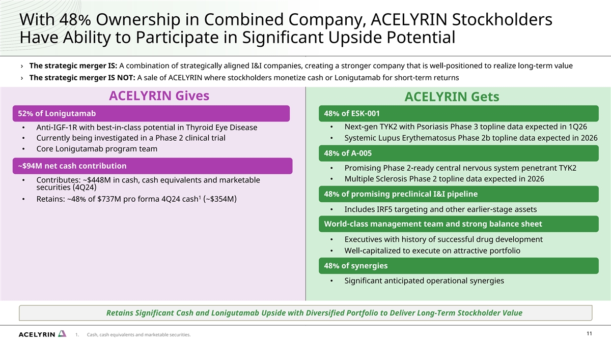 Strategic Merger Key Terms › All Stock Merger Consideration › ACELYRIN stockholders to receive 0.4814 shares of Alumis common stock for each share of ACELYRIN common stock owned Pro Forma › Alumis stockholders to own approximately 52% of the combined company 1 Ownership › ACELYRIN stockholders to own approximately 48% of the combined company › ~$737M pro forma cash at the end of Q4 2024 Cash Position › Expect pro forma financial plans to extend runway into 2027 › Combined company to operate under the Alumis name Leadership › The combined company will be led by current Alumis executive team › Alumis Board will expand to nine directors, including two additional directors from ACELYRIN’s Board Transaction › Expected in the second quarter of 2025 Closing › Subject to approval of Alumis and ACELYRIN stockholders and satisfaction of other customary closing conditions and Conditions 1. On a fully diluted basis based on the capitalizations of ACELYRIN and Alumis at the time of the merger agreement. 10