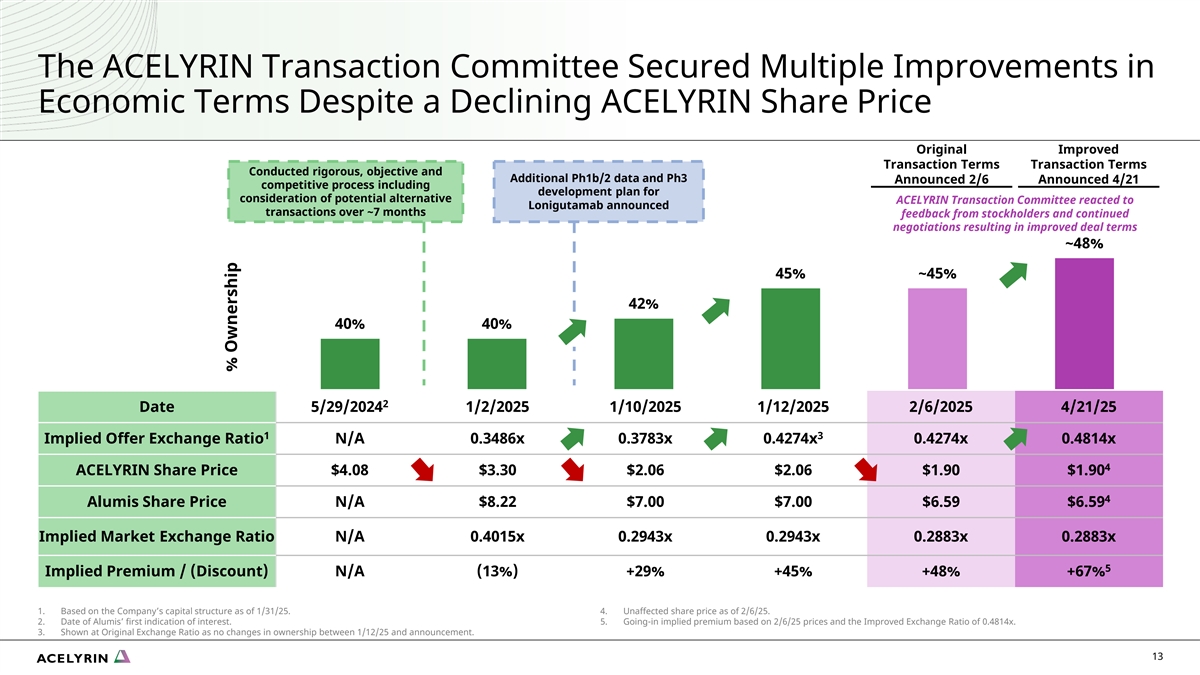 ACELYRIN’s Board Believes that it Achieved Favorable Terms and Attractive Pro Forma Ownership for ACELYRIN Stockholders (values in millions, except per share values) Alumis Discounted ACELYRIN Discounted 1 Cash Flow Analysis Exchange Ratio (Implied Ownership) Cash Flow Analysis Equity Value Equity Value $621 - $923 $481 - $602 ACELYRIN low ACELYRIN high 2 2 vs. vs. Equity Value Per Share Equity Value Per Share Alumis high Alumis low 0.2890x 0.5119x $11.10 - $15.88 $4.59 - $5.68 (34%) (49%) Based on ACELYRIN's Adjusted Based on ACELYRIN Management 3,4 3,4 Financial Projections for Alumis Projections ▪ Discount rate of 14.5% to 12.5% ▪ Discount rate of 15.25% to 13.25% Pre-Announcement At-Market Improved Exchange Ratio: 0.4814x Exchange Ratio: 0.2883x Implied Ownership: 48% 1. All exchange ratios have been calculated using unrounded amounts. 2. Share prices are shown rounded to two digits. 3. The Joint Proxy/Prospectus contains a detailed summary of the financial analyses performed by Guggenheim Securities in connection with its February 6, 2025 Presentation to the ACELYRIN board. Guggenheim Securities’ analyses were subject to the assumptions made, procedures followed, matters considered and limitations, qualifications and other conditions contained in the February 6, 2025 Presentation and related fairness opinion, and were necessarily based on economic, business, capital markets and other conditions, and the information made available to Guggenheim Securities as of the date of such presentation and fairness opinion. 4. Excludes synergies and transactions costs. 12
