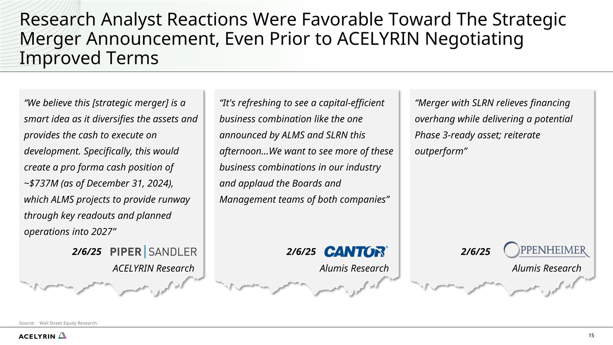 The ACELYRIN Board Believes that the Combination with Alumis is Expected to be Value Accretive to ACELYRIN Stockholders Via Synergies, Scale and Shared Ownership of a Diversified Portfolio › Opportunity to participate in significant upside from 1Q26 ESK-001 pivotal readout and future Lonigutamab catalysts ACELYRIN Equity Value Per Share Implied Per Share Values Based on the February 6, 2025 1 Trading Values 4 Presentation › ACELYRIN’s stockholders are receiving a significant going-in premium (based on Alumis’ 4/17 › ACELYRIN’s stockholders are expected to experience trading VWAP since announcement × Improved Exchange Ratio) vs. 2/6 unaffected ACELYRIN significant DCF-based value accretion (Pro Forma Synergized trading price DCF per share × Improved Exchange Ratio) vs. ACELYRIN Standalone DCF per share $8.96 49% going-in implied premium to ACELYRIN $5.68 2 stockholders $6.90 $2.83 $4.59 $2.20 $1.90 4/17 Implied Implied Per Share Price Implied Per Share Price 2/6 Unaffected 4/17 ACELYRIN Consideration per Reflected in ACELYRIN Based on the Pro Forma ACELYRIN Trading Trading Price ACELYRIN Share Based on Standalone DCF Analysis DCF Analysis in the Price Alumis Trading VWAP in the February 6, 2025 February 6, 2025 3 4 Since Announcment Presentation Presentation (Synergized) and Adjusted for the 1. Based on ACELYRIN or Alumis closing prices (NASDAQ). 4 2. Based on implied consideration per ACELYRIN share divided by 2/6 unaffected ACELYRIN trading price. Improved Exchange Ratio 3. Implied value per ACELYRIN share based on Alumis trading volume weighted average price of $5.88 multiplied by the Improved Exchange Ratio of 0.4814x. 4. The Joint Proxy/Prospectus contains a detailed summary of the financial analyses performed by Guggenheim Securities in connection with its February 6, 2025 Presentation to the ACELYRIN board. Guggenheim Securities' analyses were subject to the assumptions made, procedures followed, matters considered and limitations, qualifications and other conditions contained in the February 6, 2025 Presentation and related fairness opinion, and were necessarily based on economic, business, capital markets and other conditions, and the information made available to Guggenheim Securities as of the date of such presentation and fairness opinion. The implied per share Standalone DCF Analysis equity values set forth above are based on the range of implied equity values calculated in the ACELYRIN Standalone DCF Analysis in the February 6, 2025 Presentation. The implied per share Pro Forma DCF Analysis (Synergized) equity values set forth above are based on the range of implied equity values calculated in the Pro Forma DCF Analysis (Synergized) in the February 6, 2025 Presentation and have been adjusted to reflect the Improved Exchange Ratio in lieu of the Original Exchange Ratio. 14