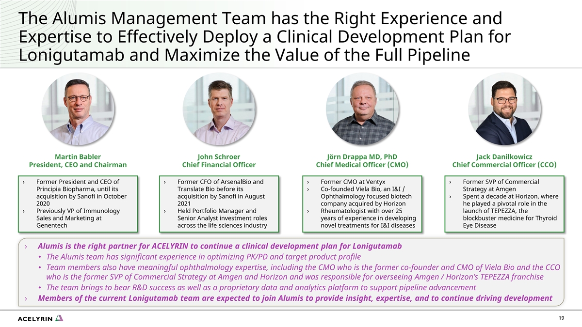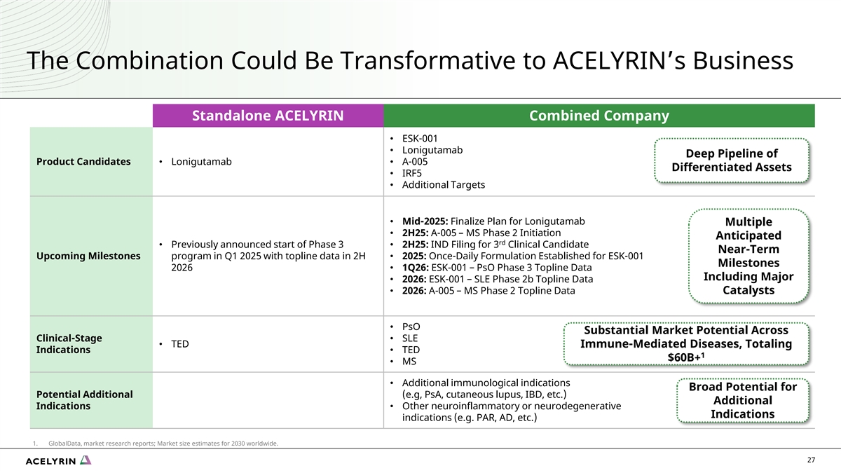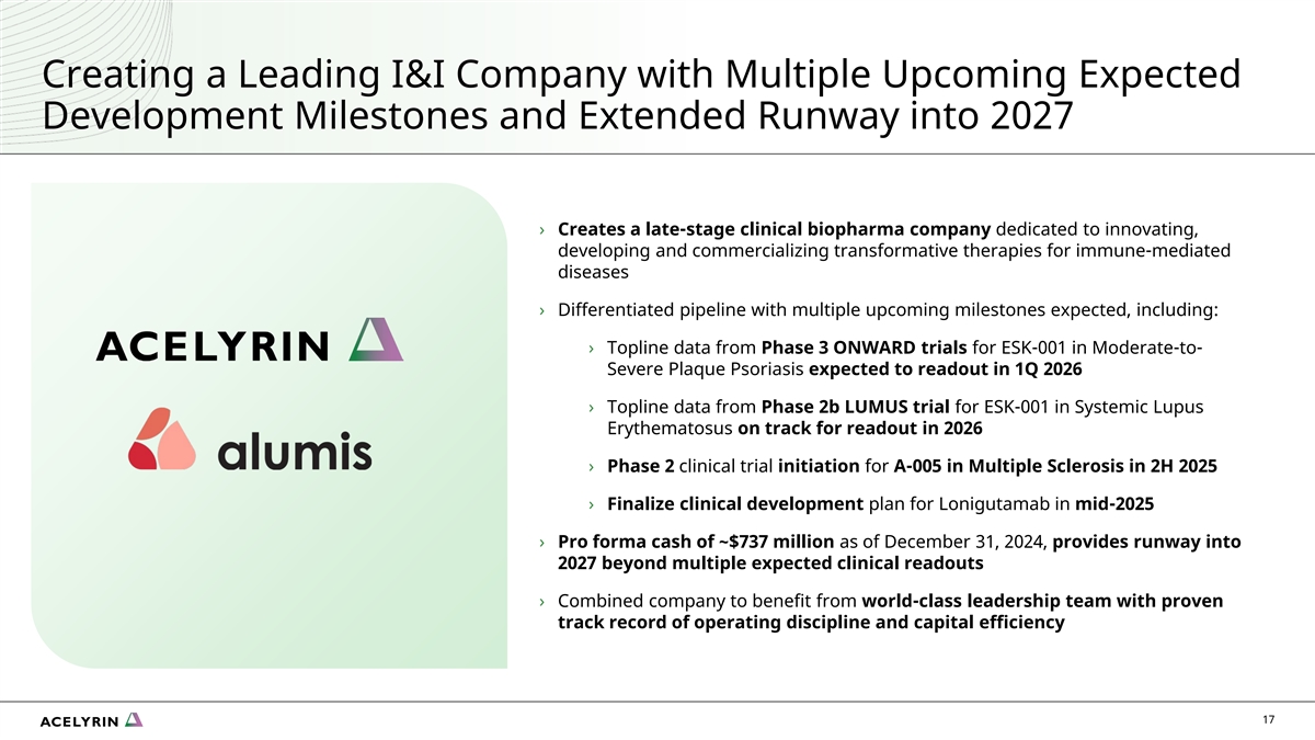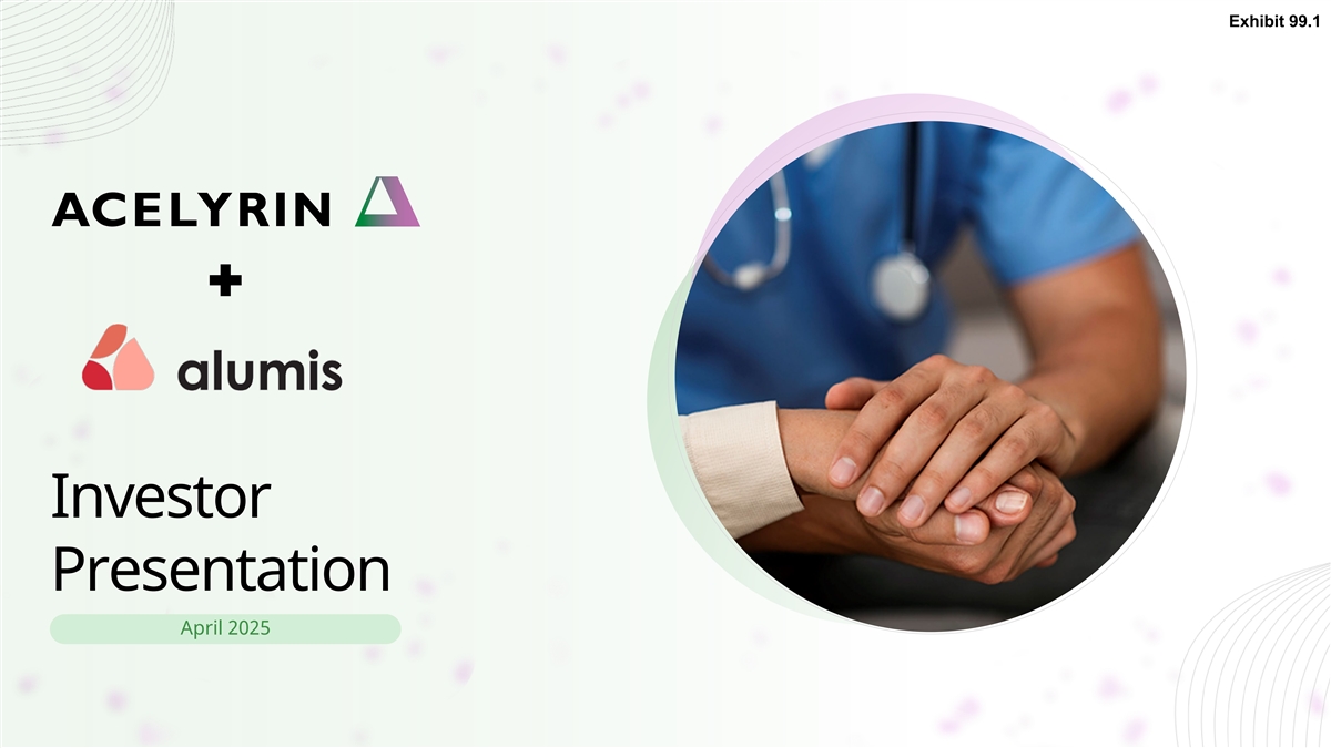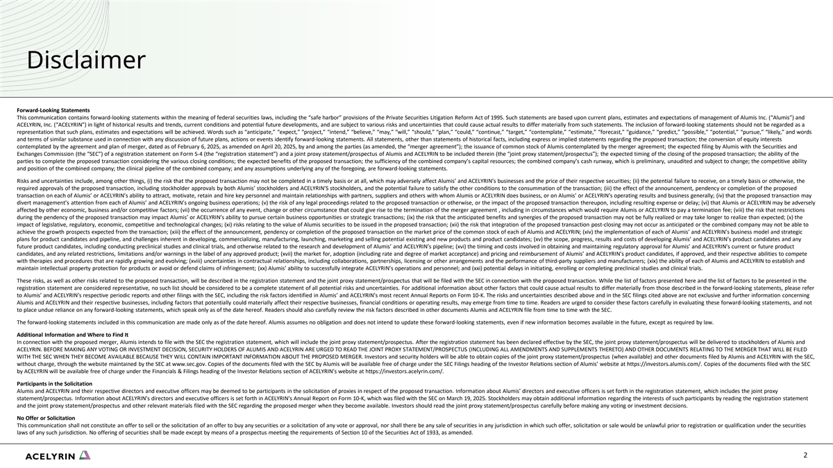 Disclaimer Forward-Looking Statements This communication contains forward-looking statements within the meaning of federal securities laws, including the “safe harbor” provisions of the Private Securities Litigation Reform Act of 1995. Such statements are based upon current plans, estimates and expectations of management of Alumis Inc. (“Alumis”) and ACELYRIN, Inc. (“ACELYRIN”) in light of historical results and trends, current conditions and potential future developments, and are subject to various risks and uncertainties that could cause actual results to differ materially from such statements. The inclusion of forward-looking statements should not be regarded as a representation that such plans, estimates and expectations will be achieved. Words such as “anticipate,” “expect,” “project,” “intend,” “believe,” “may,” “will,” “should,” “plan,” “could,” “continue,” “target,” “contemplate,” “estimate,” “forecast,” “guidance,” “predict,” “possible,” “potential,” “pursue,” “likely,” and words and terms of similar substance used in connection with any discussion of future plans, actions or events identify forward-looking statements. All statements, other than statements of historical facts, including express or implied statements regarding the proposed transaction; the conversion of equity interests contemplated by the agreement and plan of merger, dated as of February 6, 2025, as amended on April 20, 2025, by and among the parties (as amended, the “merger agreement”); the issuance of common stock of Alumis contemplated by the merger agreement; the expected filing by Alumis with the Securities and Exchanges Commission (the “SEC”) of a registration statement on Form S-4 (the “registration statement”) and a joint proxy statement/prospectus of Alumis and ACELYRIN to be included therein (the “joint proxy statement/prospectus”); the expected timing of the closing of the proposed transaction; the ability of the parties to complete the proposed transaction considering the various closing conditions; the expected benefits of the proposed transaction; the sufficiency of the combined company’s capital resources; the combined company’s cash runway, which is preliminary, unaudited and subject to change; the competitive ability and position of the combined company; the clinical pipeline of the combined company; and any assumptions underlying any of the foregoing, are forward-looking statements. Risks and uncertainties include, among other things, (i) the risk that the proposed transaction may not be completed in a timely basis or at all, which may adversely affect Alumis’ and ACELYRIN’s businesses and the price of their respective securities; (ii) the potential failure to receive, on a timely basis or otherwise, the required approvals of the proposed transaction, including stockholder approvals by both Alumis’ stockholders and ACELYRIN’S stockholders, and the potential failure to satisfy the other conditions to the consummation of the transaction; (iii) the effect of the announcement, pendency or completion of the proposed transaction on each of Alumis’ or ACELYRIN’s ability to attract, motivate, retain and hire key personnel and maintain relationships with partners, suppliers and others with whom Alumis or ACELYRIN does business, or on Alumis’ or ACELYRIN’s operating results and business generally; (iv) that the proposed transaction may divert management’s attention from each of Alumis’ and ACELYRIN’s ongoing business operations; (v) the risk of any legal proceedings related to the proposed transaction or otherwise, or the impact of the proposed transaction thereupon, including resulting expense or delay; (vi) that Alumis or ACELYRIN may be adversely affected by other economic, business and/or competitive factors; (vii) the occurrence of any event, change or other circumstance that could give rise to the termination of the merger agreement , including in circumstances which would require Alumis or ACELYRIN to pay a termination fee; (viii) the risk that restrictions during the pendency of the proposed transaction may impact Alumis’ or ACELYRIN’s ability to pursue certain business opportunities or strategic transactions; (ix) the risk that the anticipated benefits and synergies of the proposed transaction may not be fully realized or may take longer to realize than expected; (x) the impact of legislative, regulatory, economic, competitive and technological changes; (xi) risks relating to the value of Alumis securities to be issued in the proposed transaction; (xii) the risk that integration of the proposed transaction post-closing may not occur as anticipated or the combined company may not be able to achieve the growth prospects expected from the transaction; (xiii) the effect of the announcement, pendency or completion of the proposed transaction on the market price of the common stock of each of Alumis and ACELYRIN; (xiv) the implementation of each of Alumis’ and ACELYRIN’s business model and strategic plans for product candidates and pipeline, and challenges inherent in developing, commercializing, manufacturing, launching, marketing and selling potential existing and new products and product candidates; (xv) the scope, progress, results and costs of developing Alumis’ and ACELYRIN’s product candidates and any future product candidates, including conducting preclinical studies and clinical trials, and otherwise related to the research and development of Alumis’ and ACELYRIN’s pipeline; (xvi) the timing and costs involved in obtaining and maintaining regulatory approval for Alumis’ and ACELYRIN’s current or future product candidates, and any related restrictions, limitations and/or warnings in the label of any approved product; (xvii) the market for, adoption (including rate and degree of market acceptance) and pricing and reimbursement of Alumis