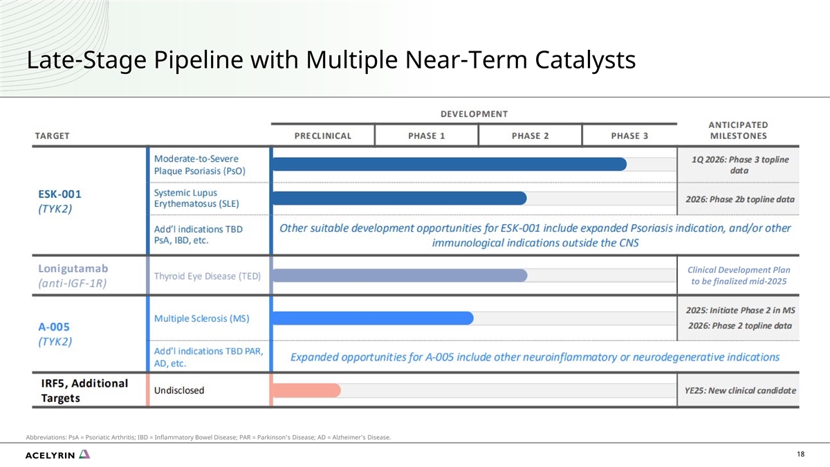 Creating a Leading I&I Company with Multiple Upcoming Expected Development Milestones and Extended Runway into 2027 › Creates a late-stage clinical biopharma company dedicated to innovating, developing and commercializing transformative therapies for immune-mediated diseases › Differentiated pipeline with multiple upcoming milestones expected, including: › Topline data from Phase 3 ONWARD trials for ESK-001 in Moderate-to- Severe Plaque Psoriasis expected to readout in 1Q 2026 › Topline data from Phase 2b LUMUS trial for ESK-001 in Systemic Lupus Erythematosus on track for readout in 2026 › Phase 2 clinical trial initiation for A-005 in Multiple Sclerosis in 2H 2025 › Finalize clinical development plan for Lonigutamab in mid-2025 › Pro forma cash of ~$737 million as of December 31, 2024, provides runway into 2027 beyond multiple expected clinical readouts › Combined company to benefit from world-class leadership team with proven track record of operating discipline and capital efficiency 17