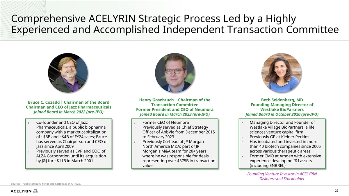 Comprehensive ACELYRIN Strategic Process Led by a Highly Experienced and Accomplished Independent Transaction Committee Henry Gosebruch | Chairman of the Beth Seidenberg, MD Bruce C. Cozadd | Chairman of the Board Transaction Committee Founding Managing Director of Chairman and CEO of Jazz Pharmaceuticals Former President and CEO of Neumora Westlake BioPartners Joined Board in March 2022 (pre-IPO) Joined Board in March 2023 (pre-IPO) Joined Board in October 2020 (pre-IPO) › Co-founder and CEO of Jazz › Former CEO of Neumora › Managing Director and Founder of Pharmaceuticals, a public biopharma › Previously served as Chief Strategy Westlake Village BioPartners, a life company with a market capitalization Officer of AbbVie from December 2015 sciences venture capital firm of ~$6B and ~$4B of FY24 sales; Bruce to February 2023 › Previously GP at Kleiner Perkins has served as Chairperson and CEO of › Previously Co-head of JP Morgan › Has incubated and invested in more Jazz since April 2009 North America M&A; part of JP than 40 biotech companies since 2005 › Previously served as EVP and COO of Morgan’s M&A team for 20+ years across various therapeutic areas ALZA Corporation until its acquisition where he was responsible for deals › Former CMO at Amgen with extensive by J&J for ~$11B in March 2001 representing over $375B in transaction experience developing I&I assets value (including ENBREL) Founding Venture Investor in ACELYRIN Disinterested Stockholder Source: Public company filings and FactSet as of 4/17/25. 22