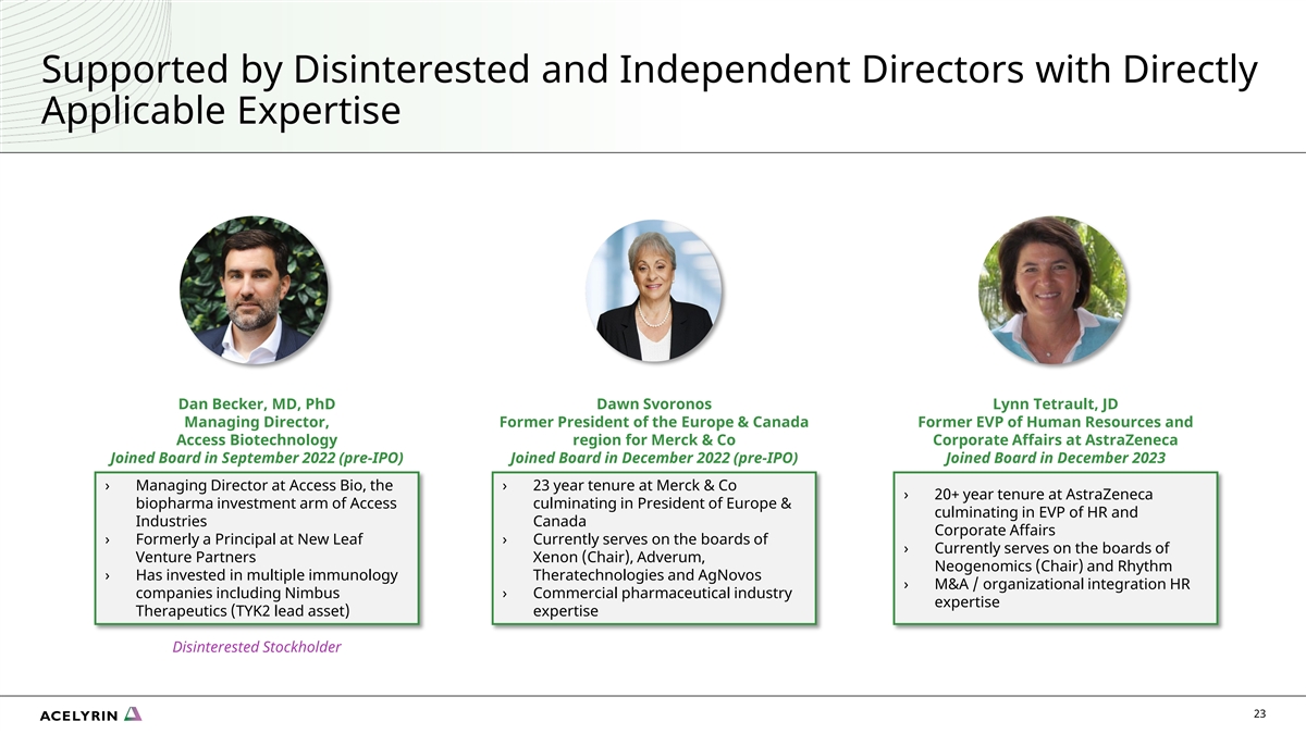 Supported by Disinterested and Independent Directors with Directly Applicable Expertise Dan Becker, MD, PhD Dawn Svoronos Lynn Tetrault, JD Managing Director, Former President of the Europe & Canada Former EVP of Human Resources and Access Biotechnology region for Merck & Co Corporate Affairs at AstraZeneca Joined Board in September 2022 (pre-IPO) Joined Board in December 2022 (pre-IPO) Joined Board in December 2023 › Managing Director at Access Bio, the › 23 year tenure at Merck & Co › 20+ year tenure at AstraZeneca biopharma investment arm of Access culminating in President of Europe & culminating in EVP of HR and Industries Canada Corporate Affairs › Formerly a Principal at New Leaf › Currently serves on the boards of › Currently serves on the boards of Venture Partners Xenon (Chair), Adverum, Neogenomics (Chair) and Rhythm › Has invested in multiple immunology Theratechnologies and AgNovos › M&A / organizational integration HR companies including Nimbus › Commercial pharmaceutical industry expertise Therapeutics (TYK2 lead asset) expertise Disinterested Stockholder 23