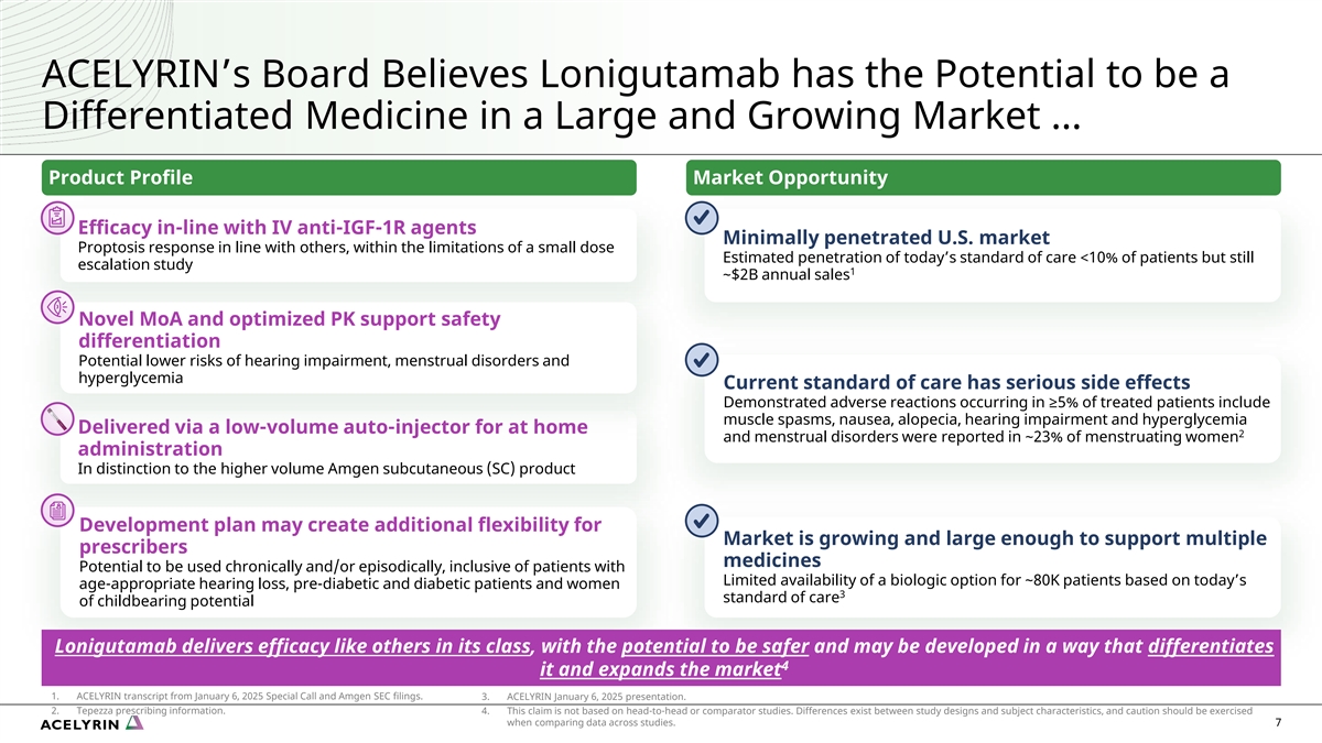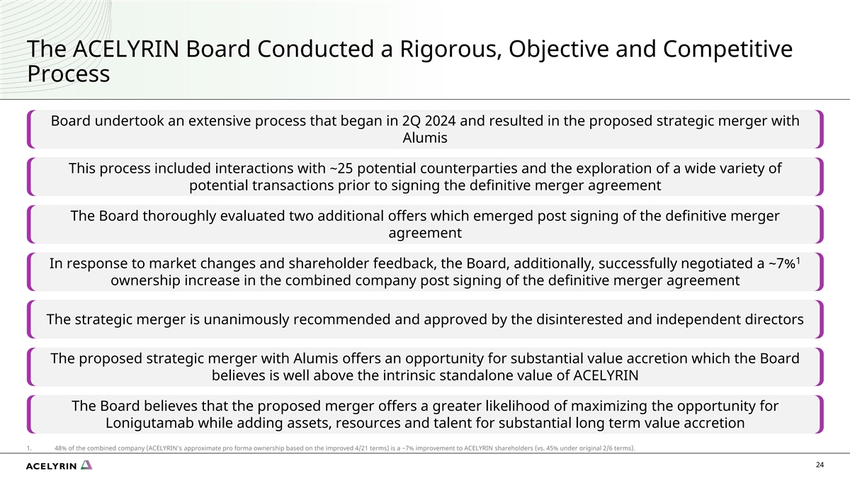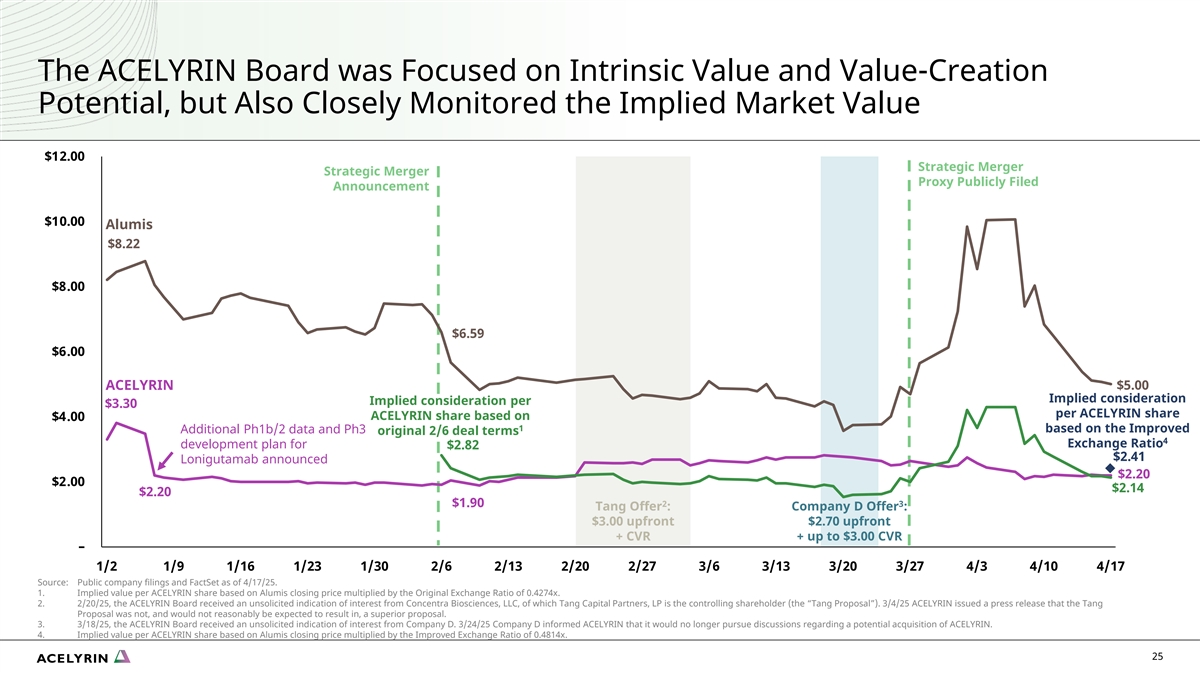 The ACELYRIN Board Conducted a Rigorous, Objective and Competitive Process Board undertook an extensive process that began in 2Q 2024 and resulted in the proposed strategic merger with Alumis This process included interactions with ~25 potential counterparties and the exploration of a wide variety of potential transactions prior to signing the definitive merger agreement The Board thoroughly evaluated two additional offers which emerged post signing of the definitive merger agreement 1 In response to market changes and shareholder feedback, the Board, additionally, successfully negotiated a ~7% ownership increase in the combined company post signing of the definitive merger agreement The strategic merger is unanimously recommended and approved by the disinterested and independent directors The proposed strategic merger with Alumis offers an opportunity for substantial value accretion which the Board believes is well above the intrinsic standalone value of ACELYRIN The Board believes that the proposed merger offers a greater likelihood of maximizing the opportunity for Lonigutamab while adding assets, resources and talent for substantial long term value accretion 1. 48% of the combined company (ACELYRIN’s approximate pro forma ownership based on the improved 4/21 terms) is a ~7% improvement to ACELYRIN shareholders (vs. 45% under original 2/6 terms). 24