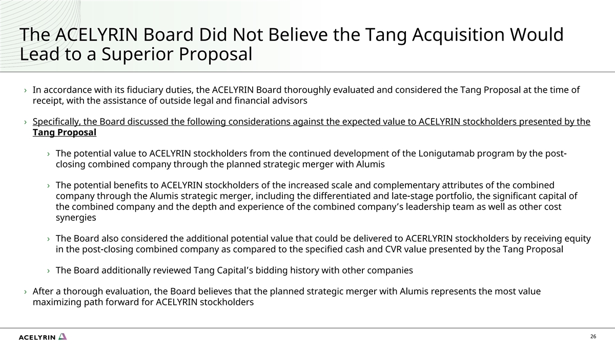 The ACELYRIN Board Did Not Believe the Tang Acquisition Would Lead to a Superior Proposal › In accordance with its fiduciary duties, the ACELYRIN Board thoroughly evaluated and considered the Tang Proposal at the time of receipt, with the assistance of outside legal and financial advisors › Specifically, the Board discussed the following considerations against the expected value to ACELYRIN stockholders presented by the Tang Proposal › The potential value to ACELYRIN stockholders from the continued development of the Lonigutamab program by the post- closing combined company through the planned strategic merger with Alumis › The potential benefits to ACELYRIN stockholders of the increased scale and complementary attributes of the combined company through the Alumis strategic merger, including the differentiated and late-stage portfolio, the significant capital of the combined company and the depth and experience of the combined company’s leadership team as well as other cost synergies › The Board also considered the additional potential value that could be delivered to ACERLYRIN stockholders by receiving equity in the post-closing combined company as compared to the specified cash and CVR value presented by the Tang Proposal › The Board additionally reviewed Tang Capital’s bidding history with other companies › After a thorough evaluation, the Board believes that the planned strategic merger with Alumis represents the most value maximizing path forward for ACELYRIN stockholders 26