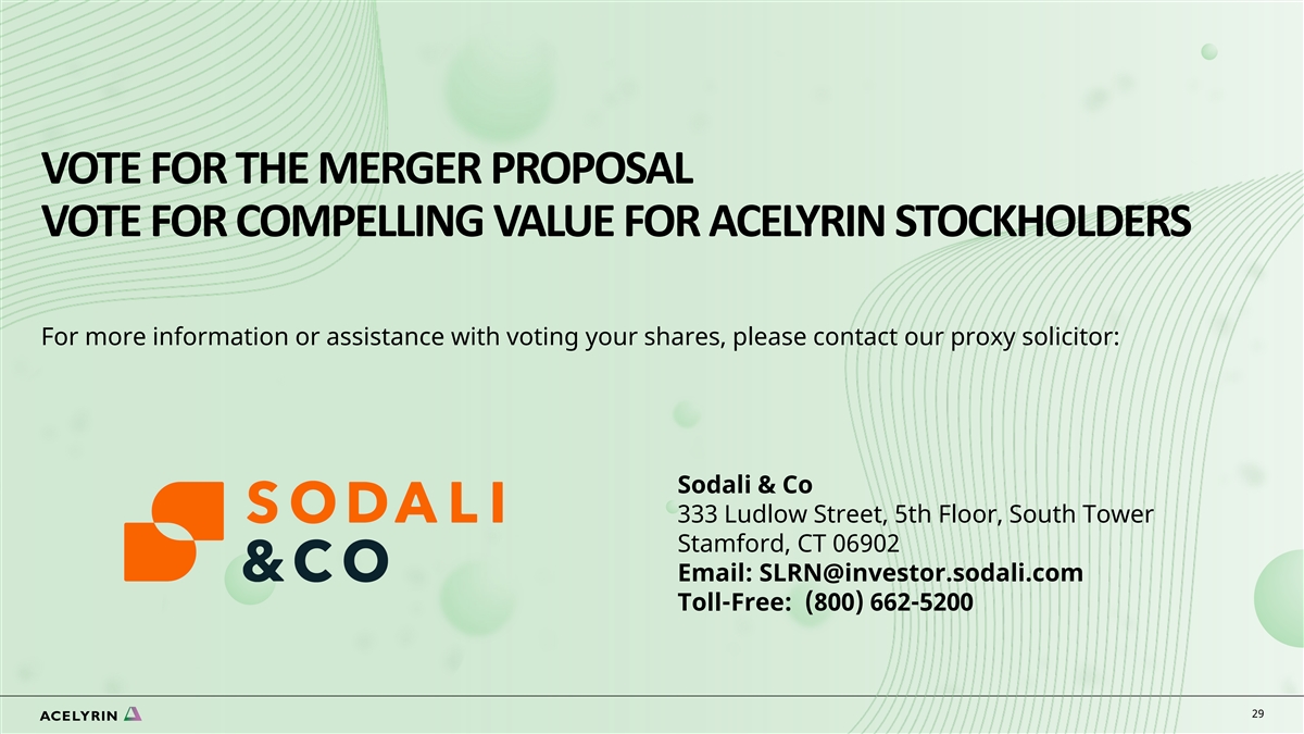 VOTE FOR THE MERGER PROPOSAL VOTE FOR COMPELLING VALUE FOR ACELYRIN STOCKHOLDERS For more information or assistance with voting your shares, please contact our proxy solicitor: Sodali & Co 333 Ludlow Street, 5th Floor, South Tower Stamford, CT 06902 Email: SLRN@investor.sodali.com Toll-Free: (800) 662-5200 29