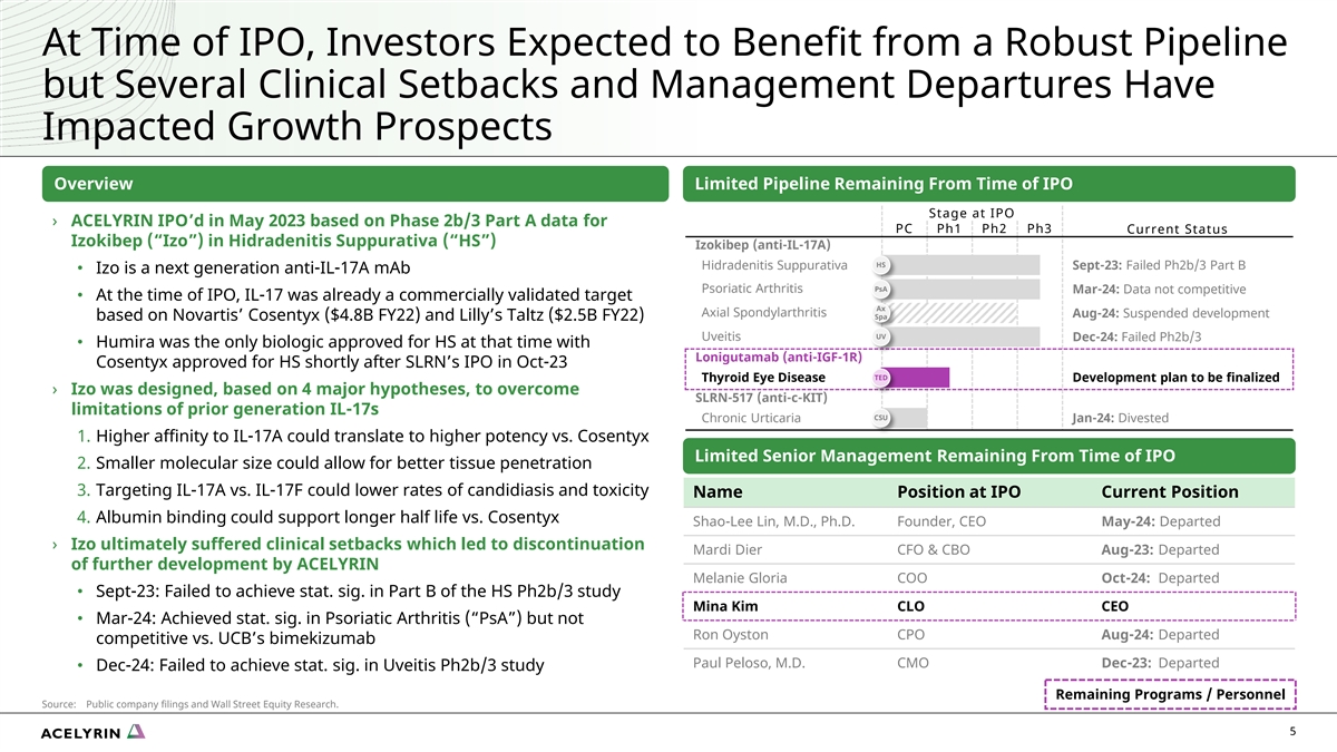 At Time of IPO, Investors Expected to Benefit from a Robust Pipeline but Several Clinical Setbacks and Management Departures Have Impacted Growth Prospects Overview Limited Pipeline Remaining From Time of IPO Stage at IPO › ACELYRIN IPO’d in May 2023 based on Phase 2b/3 Part A data for PC Ph1 Ph2 Ph3 Current Status Izokibep (“Izo”) in Hidradenitis Suppurativa (“HS”) Izokibep (anti-IL-17A) HS Hidradenitis Suppurativa Sept-23: Failed Ph2b/3 Part B • Izo is a next generation anti-IL-17A mAb Psoriatic Arthritis PsA Mar-24: Data not competitive • At the time of IPO, IL-17 was already a commercially validated target Ax Axial Spondylarthritis Aug-24: Suspended development based on Novartis’ Cosentyx ($4.8B FY22) and Lilly’s Taltz ($2.5B FY22) Spa UV Uveitis Dec-24: Failed Ph2b/3 • Humira was the only biologic approved for HS at that time with Lonigutamab (anti-IGF-1R) Cosentyx approved for HS shortly after SLRN’s IPO in Oct-23 TED Thyroid Eye Disease Development plan to be finalized › Izo was designed, based on 4 major hypotheses, to overcome SLRN-517 (anti-c-KIT) limitations of prior generation IL-17s CSU Chronic Urticaria Jan-24: Divested 1. Higher affinity to IL-17A could translate to higher potency vs. Cosentyx Limited Senior Management Remaining From Time of IPO 2. Smaller molecular size could allow for better tissue penetration 3. Targeting IL-17A vs. IL-17F could lower rates of candidiasis and toxicity Name Position at IPO Current Position 4. Albumin binding could support longer half life vs. Cosentyx Shao-Lee Lin, M.D., Ph.D. Founder, CEO May-24: Departed › Izo ultimately suffered clinical setbacks which led to discontinuation Mardi Dier CFO & CBO Aug-23: Departed of further development by ACELYRIN Melanie Gloria COO Oct-24: Departed • Sept-23: Failed to achieve stat. sig. in Part B of the HS Ph2b/3 study Mina Kim CLO CEO • Mar-24: Achieved stat. sig. in Psoriatic Arthritis (“PsA”) but not Ron Oyston CPO Aug-24: Departed competitive vs. UCB’s bimekizumab Paul Peloso, M.D. CMO Dec-23: Departed • Dec-24: Failed to achieve stat. sig. in Uveitis Ph2b/3 study Remaining Programs / Personnel Source: Public company filings and Wall Street Equity Research. 5