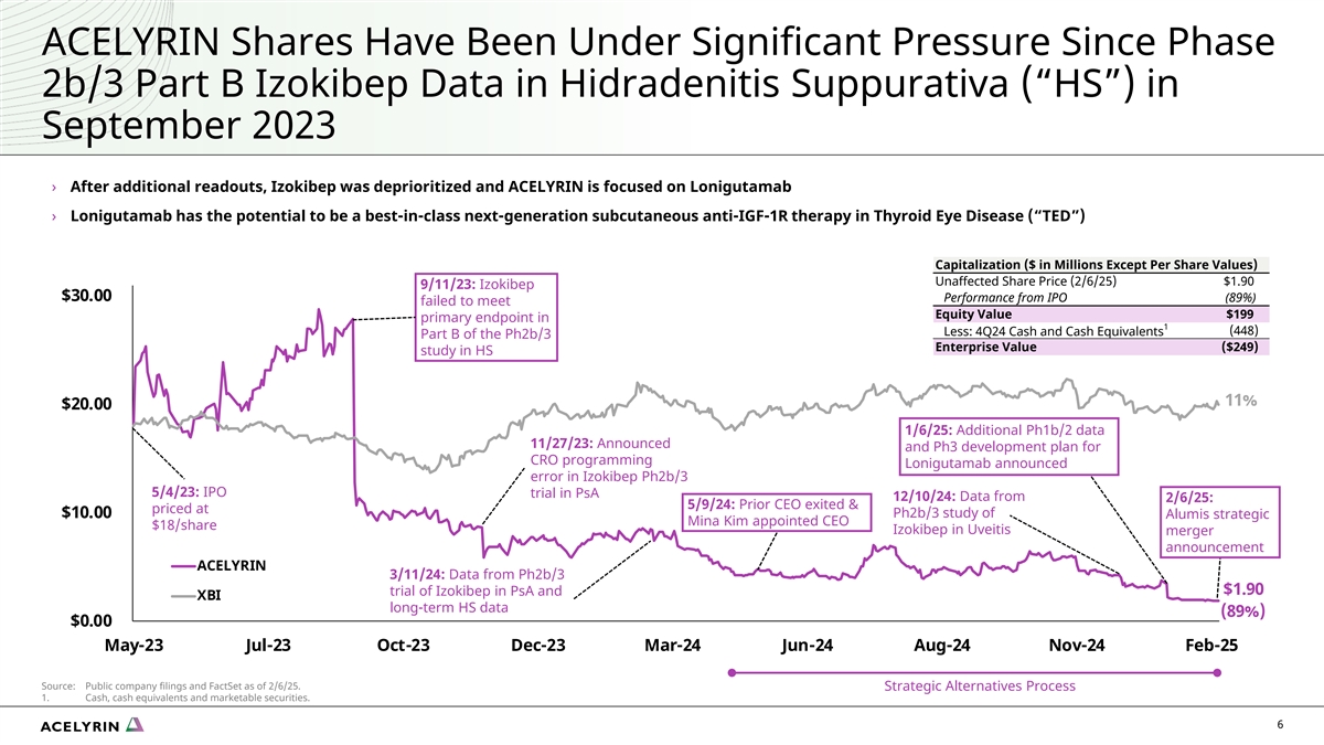 ACELYRIN Shares Have Been Under Significant Pressure Since Phase 2b/3 Part B Izokibep Data in Hidradenitis Suppurativa (“HS”) in September 2023 › After additional readouts, Izokibep was deprioritized and ACELYRIN is focused on Lonigutamab › Lonigutamab has the potential to be a best-in-class next-generation subcutaneous anti-IGF-1R therapy in Thyroid Eye Disease (“TED”) Capitalization ($ in Millions Except Per Share Values) Unaffected Share Price (2/6/25) $1.90 9/11/23: Izokibep $30.00 Performance from IPO (89%) failed to meet Equity Value $199 primary endpoint in 1 (448) Less: 4Q24 Cash and Cash Equivalents Part B of the Ph2b/3 Enterprise Value ($249) study in HS 11% $20.00 1/6/25: Additional Ph1b/2 data 11/27/23: Announced and Ph3 development plan for CRO programming Lonigutamab announced error in Izokibep Ph2b/3 5/4/23: IPO trial in PsA 12/10/24: Data from 2/6/25: 5/9/24: Prior CEO exited & priced at Ph2b/3 study of $10.00 Alumis strategic Mina Kim appointed CEO $18/share Izokibep in Uveitis merger announcement ACELYRIN 3/11/24: Data from Ph2b/3 $1.90 trial of Izokibep in PsA and XBI long-term HS data (89%) $0.00 May-23 Jul-23 Oct-23 Dec-23 Mar-24 Jun-24 Aug-24 Nov-24 Feb-25 Source: Public company filings and FactSet as of 2/6/25. Strategic Alternatives Process 1. Cash, cash equivalents and marketable securities. 6