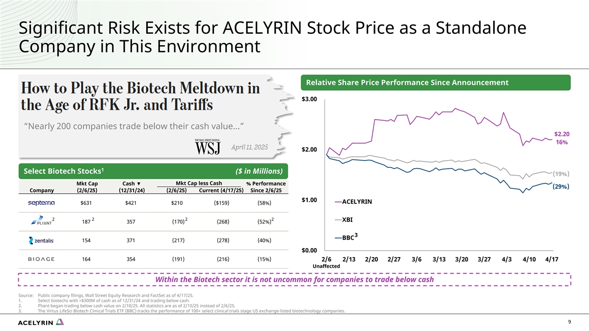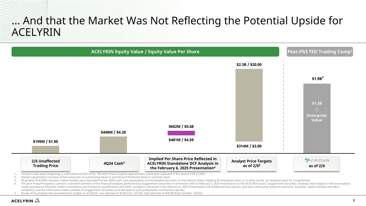 … And that the Market Was Not Reflecting the Potential Upside for ACELYRIN 1 ACELYRIN Equity Value / Equity Value Per Share Post-Ph3 TED Trading Comp $2.3B / $20.00 2 $1.9B $1.2B Enterprise Value $602M / $5.68 $448M / $4.28 $481M / $4.59 $199M / $1.90 $314M / $3.00 Implied Per Share Price Reflected in 2/6 Unaffected Analyst Price Targets 3 4Q24 Cash ACELYRIN Standalone DCF Analysis in 5 Trading Price as of 2/6 as of 2/6 4 the February 6, 2025 Presentation 1. Viridian’s lead asset Veligrotug, is a derisked anti-IGF-1R for TED with Phase 3 topline data and BLA submission expected in the second half of 2025. 2. Market capitalization inclusive of full conversion of outstanding Series A and Series B Preferred Stock to common stock. 3. Illustrative ACELYRIN valuation where market cap is equivalent to the 4Q24 cash, cash equivalents and marketable securities on the balance sheet, implying $0 enterprise value, or in other words, no assigned value for Lonigutamab. 4. The Joint Proxy/Prospectus contains a detailed summary of the financial analyses performed by Guggenheim Securities in connection with its February 6, 2025 Presentation to the ACELYRIN board. Guggenheim Securities’ analyses were subject to the assumptions made, procedures followed, matters considered and limitations, qualifications and other conditions contained in the February 6, 2025 Presentation and related fairness opinion, and were necessarily based on economic, business, capital markets and other conditions, and the information made available to Guggenheim Securities as of the date of such presentation and fairness opinion. 5. Range of six analysts who provided price targets as of 2/6/25. Low estimate of $3.00 (Citi, 1/7/25); high estimate of $20.00 (Piper Sandler, 1/6/25). 8