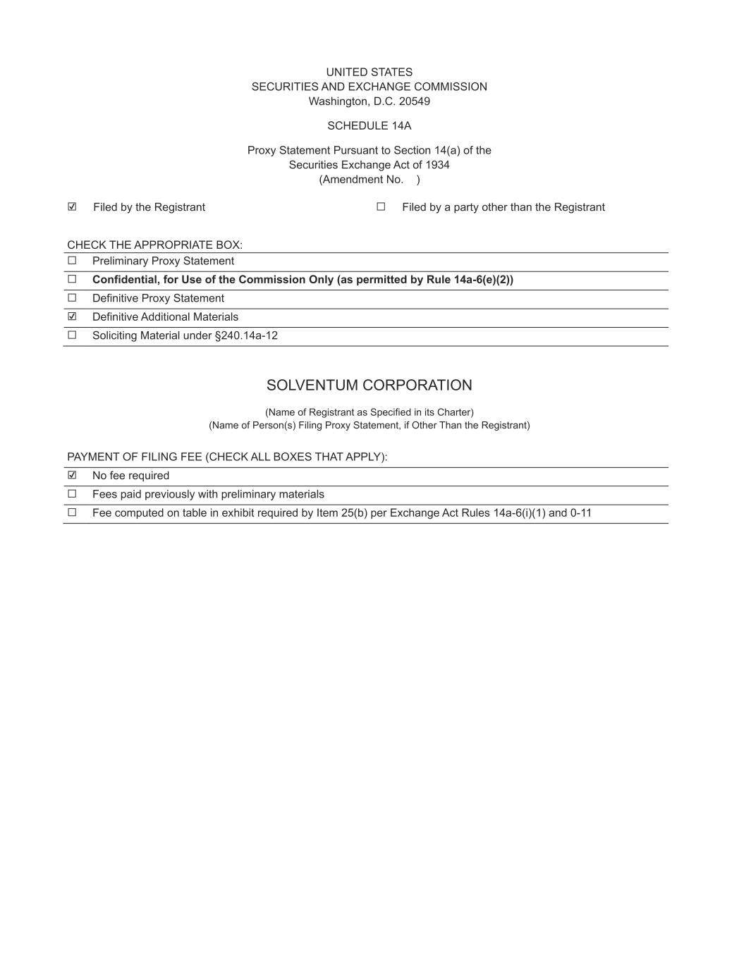 UNITED STATES SECURITIES AND EXCHANGE COMMISSION Washington, D.C. 20549 SCHEDULE 14A Proxy Statement Pursuant to Section 14(a) of the Securities Exchange Act of 1934 (Amendment No. ) ☑ Filed by the Registrant ☐ Filed by a party other than the Registrant CHECK THE APPROPRIATE BOX: ☐ Preliminary Proxy Statement ☐ Confidential, for Use of the Commission Only (as permitted by Rule 14a-6(e)(2)) ☐ Definitive Proxy Statement ☑ Definitive Additional Materials ☐ Soliciting Material under §240.14a-12 SOLVENTUM CORPORATION (Name of Registrant as Specified in its Charter) (Name of Person(s) Filing Proxy Statement, if Other Than the Registrant) PAYMENT OF FILING FEE (CHECK ALL BOXES THAT APPLY): ☑ No fee required ☐ Fees paid previously with preliminary materials ☐ Fee computed on table in exhibit required by Item 25(b) per Exchange Act Rules 14a-6(i)(1) and 0-11