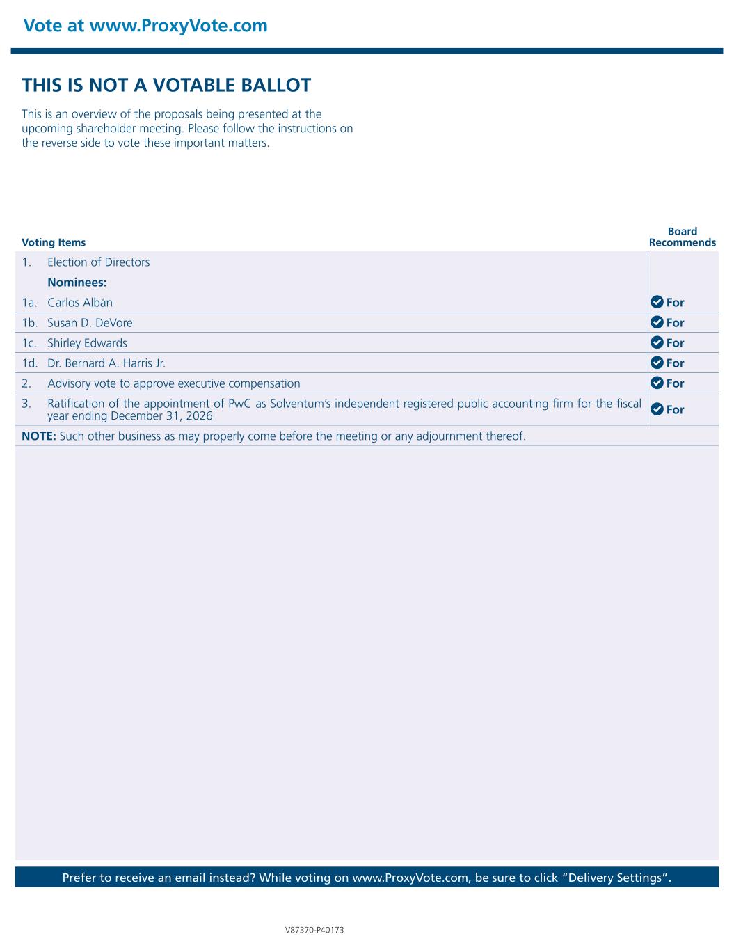 Vote at www.ProxyVote.com Prefer to receive an email instead? While voting on www.ProxyVote.com, be sure to click “Delivery Settings”. Voting Items Board Recommends V87370-P40173 THIS IS NOT A VOTABLE BALLOT This is an overview of the proposals being presented at the upcoming shareholder meeting. Please follow the instructions on the reverse side to vote these important matters. 1. Election of Directors Nominees: 1a. Carlos Albán For 1b. Susan D. DeVore For 1c. Shirley Edwards For 1d. Dr. Bernard A. Harris Jr. For 2. Advisory vote to approve executive compensation For 3. Ratification of the appointment of PwC as Solventum’s independent registered public accounting firm for the fiscal year ending December 31, 2026 For NOTE: Such other business as may properly come before the meeting or any adjournment thereof.