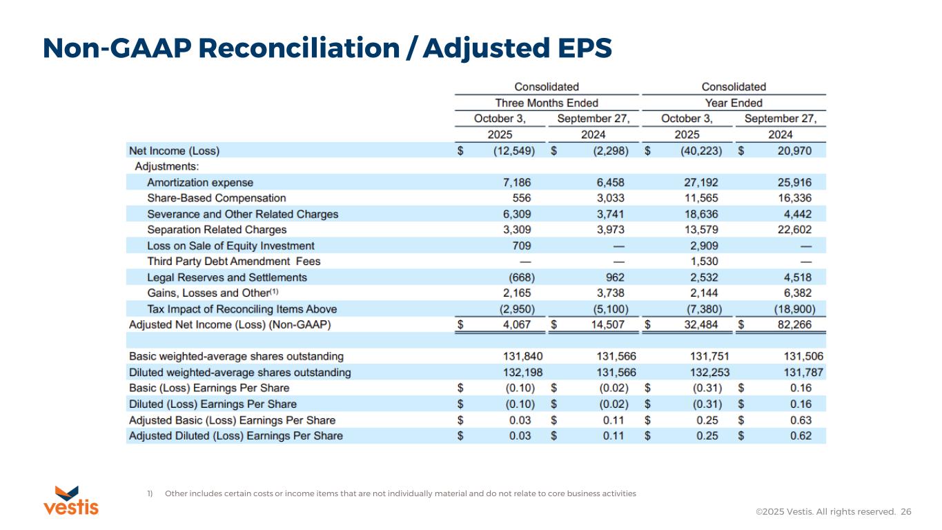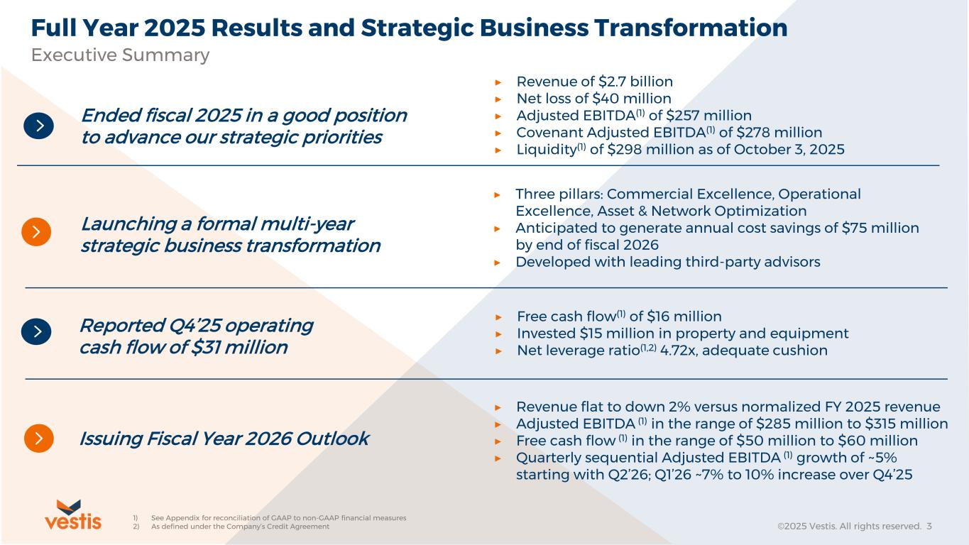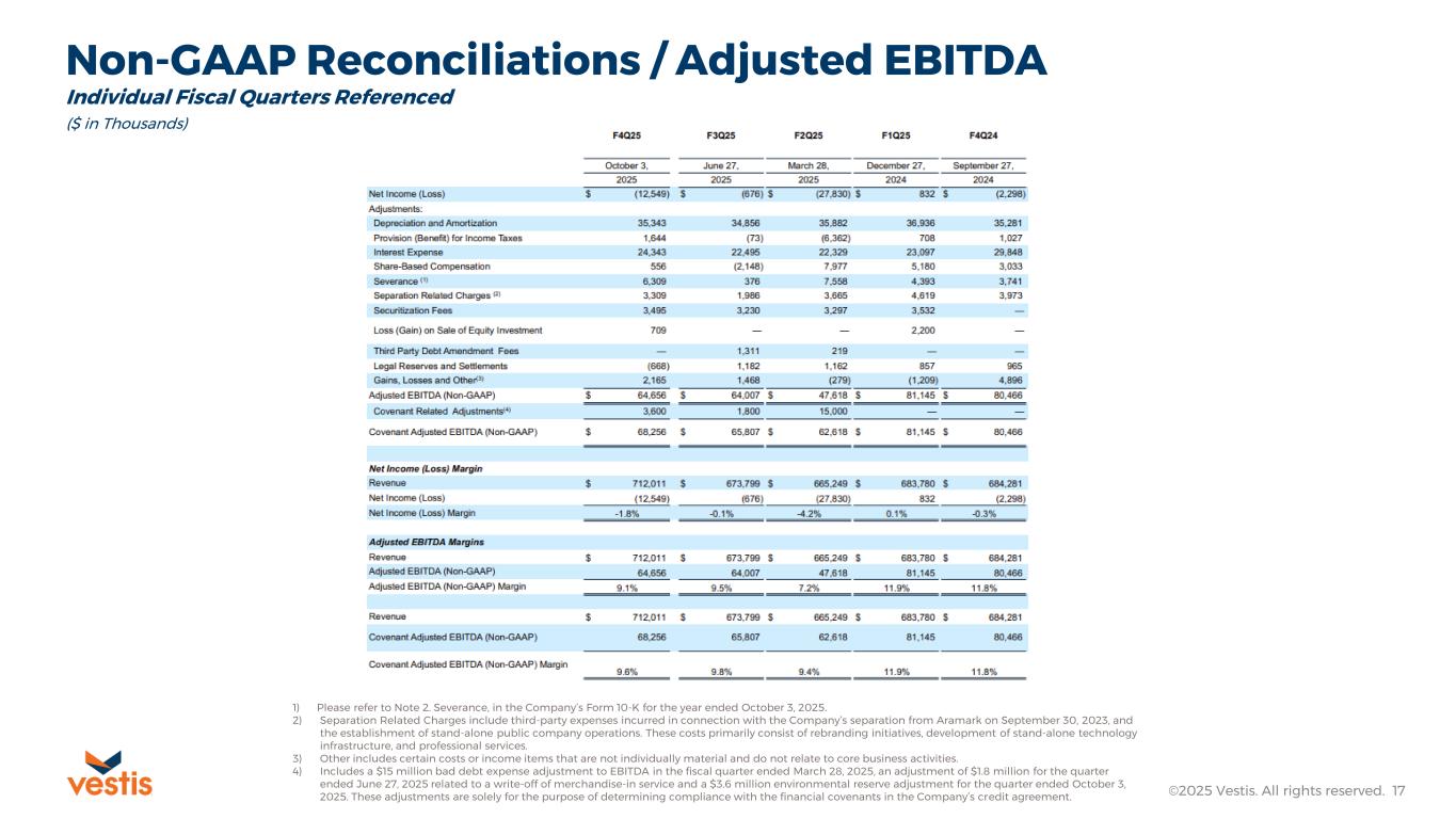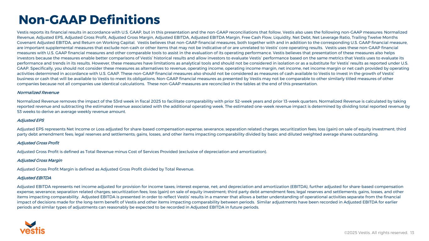 Non-GAAP Measures Vestis reports its financial results in accordance with U.S. GAAP, but in this presentation and the non-GAAP reconciliations that follow, Vestis also uses the following non-GAAP measures: Normalized Revenue, Adjusted EPS, Adjusted Gross Profit, Adjusted Gross Margin, Adjusted EBITDA, Adjusted EBITDA Margin, Free Cash Flow, Liquidity, Net Debt, Net Leverage Ratio, Trailing Twelve Months Covenant Adjusted EBITDA, and Return on Working Capital. Vestis believes that non-GAAP financial measures, both together with and in addition to the corresponding U.S. GAAP financial measure, are important supplemental measures that exclude non-cash or other items that may not be indicative of or are unrelated to Vestis’ core operating results. Vestis uses these non-GAAP financial measures with U.S. GAAP financial measures and other comparable tools to assist in the evaluation of its operating performance. Vestis believes that presentation of these measures also helps investors because the measures enable better comparisons of Vestis’ historical results and allow investors to evaluate Vestis’ performance based on the same metrics that Vestis uses to evaluate its performance and trends in its results. However, these measures have limitations as analytical tools and should not be considered in isolation or as a substitute for Vestis’ results as reported under U.S. GAAP. Specifically, you should not consider these measures as alternatives to revenue, operating income, operating income margin, net income, net income margin or net cash provided by operating activities determined in accordance with U.S. GAAP. These non-GAAP financial measures also should not be considered as measures of cash available to Vestis to invest in the growth of Vestis’ business or cash that will be available to Vestis to meet its obligations. Non-GAAP financial measures as presented by Vestis may not be comparable to other similarly titled measures of other companies because not all companies use identical calculations. These non-GAAP measures are reconciled in the tables at the end of this presentation. This presentation and the remarks made during the associated conference call are integrally related and are intended to be presented and understood together. Forward-Looking Statements This presentation contains “forward-looking statements” within the meaning of the securities laws. All statements that reflect our expectations, assumptions or projections about the future, other than statements of historical fact, are forward-looking statements, including, without limitation, forecasts relating to discussions of future operations and financial performance and statements regarding our strategy for growth, future product development, regulatory approvals, competitive position and expenditures. In some cases, forward-looking statements can be identified by words such as “potential,” “outlook,” “guidance,” “anticipate,” “continue,” “estimate,” “expect,” “will,” and “believe,” and other words and terms of similar meaning or the negative versions of such words. Examples of forward-looking statements in this release include, but are not limited to, statements regarding: the potential effects and timing of our strategic business actions to enhance both our commercial and operational processes, and our expectations regarding our fiscal year 2026 performance outlook, including the information under the heading “Fiscal Year 2026 Outlook”. These forward-looking statements are subject to risks and uncertainties that may change at any time, and actual results or outcomes may differ materially from those that we expected. Forward-looking statements are not guarantees of future performance and are subject to risks, uncertainties, and changes in circumstances that are difficult to predict including, but not limited to: unfavorable macroeconomic conditions including inflationary pressures and higher interest rates; the failure to retain current customers, renew existing customer contracts and obtain new customer contracts, which could result in continued stock volatility and potential future goodwill impairment charges; competition in our industry; our ability to comply with certain financial ratios, tests and covenants in our credit agreement, including the Net Leverage Ratio; our significant indebtedness and ability to meet debt obligations and our reliance on an accounts receivable securitization facility; our ability to successfully execute or achieve the expected benefits of our restructuring plan and other measures we may take in the future; use of artificial intelligence in our business, which could result in reputational harm, competitive harm, and legal liability; increases in fuel and energy costs and other supply chain challenges and disruptions, including as a result of ongoing military conflicts in Ukraine and the Middle East; implementation of new or increased tariffs and ongoing changes in U.S. and foreign government trade policies, including potential modifications to existing trade agreements and retaliatory measures by foreign governments; increased operating costs and obstacles to cost recovery due to the pricing and cancellation terms of our support services contracts; a determination by our customers to reduce their outsourcing or use of preferred vendors; the outcome of legal proceedings to which we are or may become subject; risks associated with suppliers from whom our products are sourced; challenge of contracts by our customers; currency risks and other risks associated with international operations, including compliance with a broad range of laws and regulations, including the United States Foreign Corrupt Practices Act; increases in labor costs or inability to hire and retain key or sufficient qualified personnel; continued or further unionization of our workforce; our expansion strategy and our ability to successfully integrate the businesses we acquire a