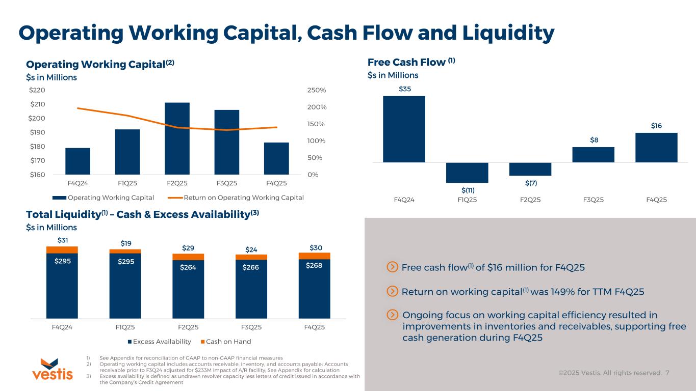 $684.3 $42.5 $(0.2) $(60.4) $(5.8) $660.4 $51.6 $712.0 F4Q24 Revenue New Business (Conversion) Pricing & Adds/Stops (Penetration) Lost Business (Churn) Direct Sales & FX Normalized F4Q25 Revenue 53rd Week F4Q25 Revenue 4Q 2025 Financial Reconciliations ©2025 Vestis. All rights reserved. 6 Net rental decline of $18.1 million driven by the loss of high-value business and adverse product mix shifts Rental $(18.1)M 4Q Revenue Reconciliation $s in Millions 4Q Adjusted EBITDA(1) Reconciliation $s in Millions Customer penetration essentially flat Direct sales decline of $5.0 million reflects lower overall sales volumes; $(0.8M) impact from foreign exchange on currency $7.9 million reduction from cost of service represents higher plant costs from adverse product mix shifts offset by lower merchandise costs from direct sales SG&A benefit of $13.3 million includes lower net selling expenses of $3.0 million combined with lower administrative costs of $10.3 million Adjusted EBITDA(1) Revenue 1) See Appendix for reconciliation of GAAP to non-GAAP financial measures 2) Includes One-Time Loss and Ruin Revenues 2 1 $80.5 $(18.1) $(7.9) $13.3 $(1.9) $(5.8) $4.6 $64.7 F4Q24 Adj. EBITDA Rental Revenue Cost of Service SG&A Non-Operating Items Direct Sales, FX & Other 53rd Week F4Q25 Adj. EBITDA