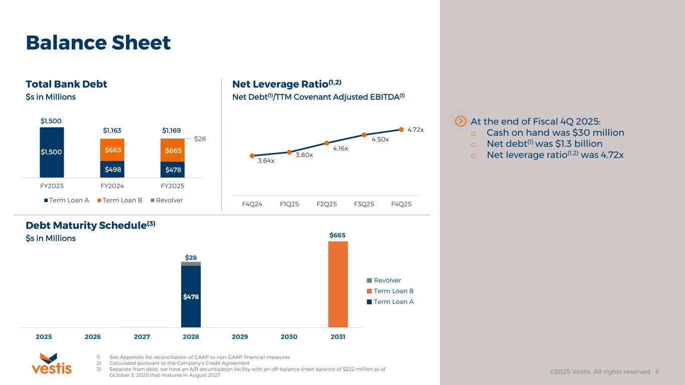 Operating Working Capital, Cash Flow and Liquidity ©2025 Vestis. All rights reserved. 7 Operating Working Capital(2) $s in Millions Total Liquidity(1) – Cash & Excess Availability(3) $s in Millions Free Cash Flow (1) $s in Millions Ongoing focus on working capital efficiency resulted in improvements in inventories and receivables, supporting free cash generation during F4Q25 Return on working capital(1) was 149% for TTM F4Q25 1) See Appendix for reconciliation of GAAP to non-GAAP financial measures 2) Operating working capital includes accounts receivable, inventory, and accounts payable; Accounts receivable prior to F3Q24 adjusted for $233M impact of A/R facility; See Appendix for calculation 3) Excess availability is defined as undrawn revolver capacity less letters of credit issued in accordance with the Company’s Credit Agreement 0% 50% 100% 150% 200% 250% $160 $170 $180 $190 $200 $210 $220 F4Q24 F1Q25 F2Q25 F3Q25 F4Q25 Operating Working Capital Return on Operating Working Capital $31 $19 $29 $24 $30 F4Q24 F1Q25 F2Q25 F3Q25 F4Q25 Excess Availability Cash on Hand $35 $(11) $(7) $8 $16 F4Q24 F1Q25 F2Q25 F3Q25 F4Q25 Free cash flow(1) of $16 million for F4Q25$268$266$264 $295$295
