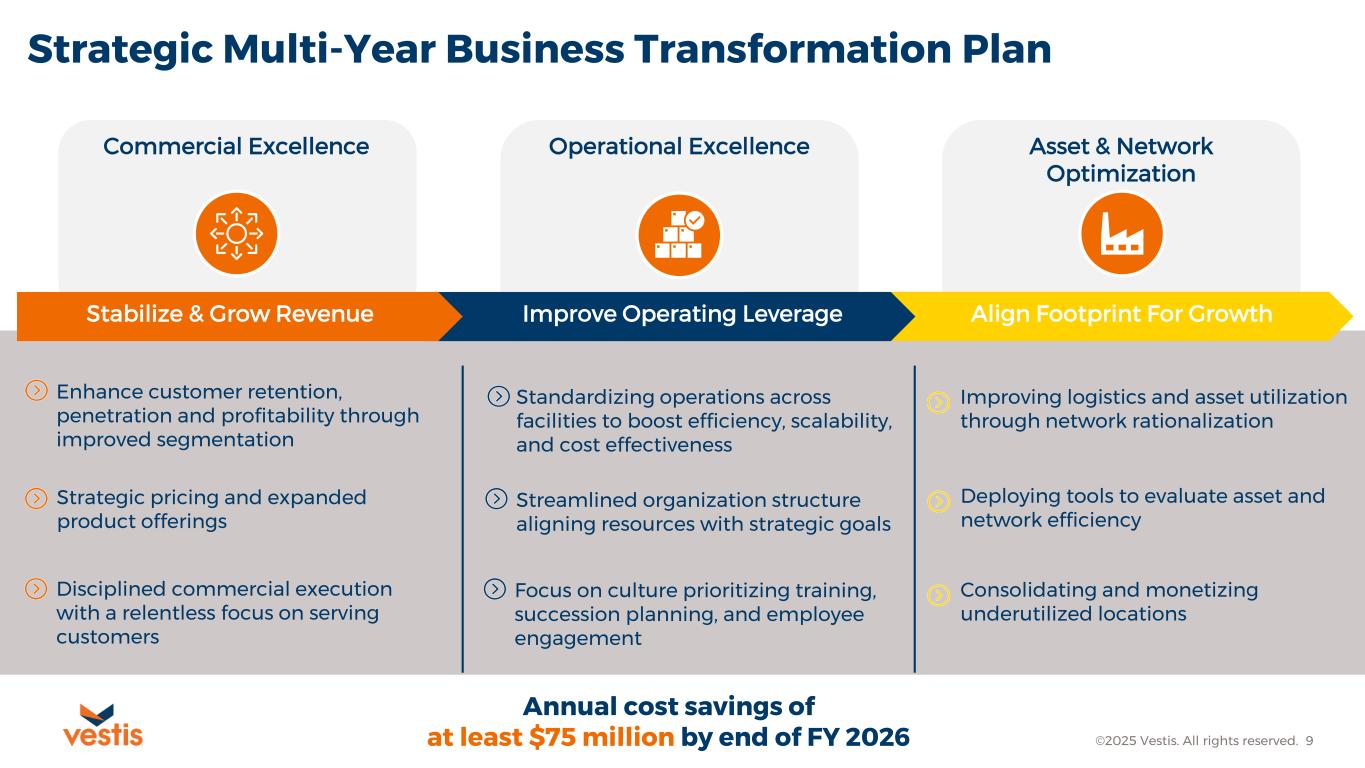 Balance Sheet ©2025 Vestis. All rights reserved. 8 Total Bank Debt $s in Millions Debt Maturity Schedule(3) $s in Millions Net Leverage Ratio(1,2) Net Debt(1)/TTM Covenant Adjusted EBITDA(1) $478 $665 $28 $222 2025 2026 2027 2028 2029 2030 2031 A/R Facility Revolver Term Loan B Term Loan A 1) See Appendix for reconciliation of GAAP to non-GAAP financial measures 2) Calculated pursuant to the Company’s Credit Agreement 3) Separate from debt, we have an A/R securitization facility with an off-balance sheet balance of $222 million as of October 3, 2025 that matures in August 2027 At the end of Fiscal 4Q 2025: o Cash on hand was $30 million o Net debt(1) was $1.3 billion o Net leverage ratio(1,2) was 4.72x$1,500 $498 $478 $665 $665 $26 FY2023 FY2024 FY2025 Term Loan A Term Loan B Revolver $1,500 $1,163 $1,169 3.64x 3.80x 4.16x 4.50x 4.72x F4Q24 F1Q25 F2Q25 F3Q25 F4Q25