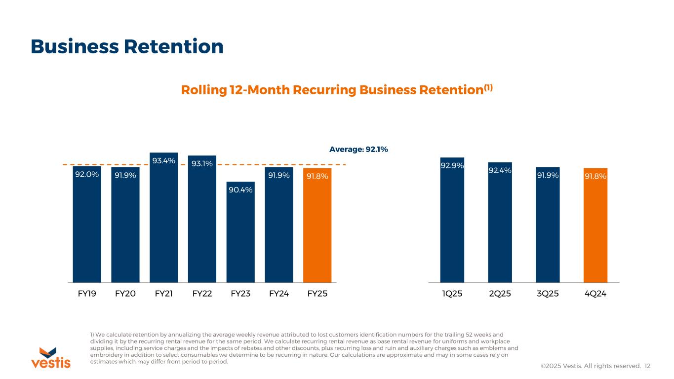 Business Retention ©2025 Vestis. All rights reserved. 12 92.0% 91.9% 93.4% 93.1% 90.4% 91.9% 91.8% FY19 FY20 FY21 FY22 FY23 FY24 FY25 Rolling 12-Month Recurring Business Retention(1) 92.9% 92.4% 91.9% 91.8% 1Q25 2Q25 3Q25 4Q24 Average: 92.1% 1) We calculate retention by annualizing the average weekly revenue attributed to lost customers identification numbers for the trailing 52 weeks and dividing it by the recurring rental revenue for the same period. We calculate recurring rental revenue as base rental revenue for uniforms and workplace supplies, including service charges and the impacts of rebates and other discounts, plus recurring loss and ruin and auxiliary charges such as emblems and embroidery in addition to select consumables we determine to be recurring in nature. Our calculations are approximate and may in some cases rely on estimates which may differ from period to period.