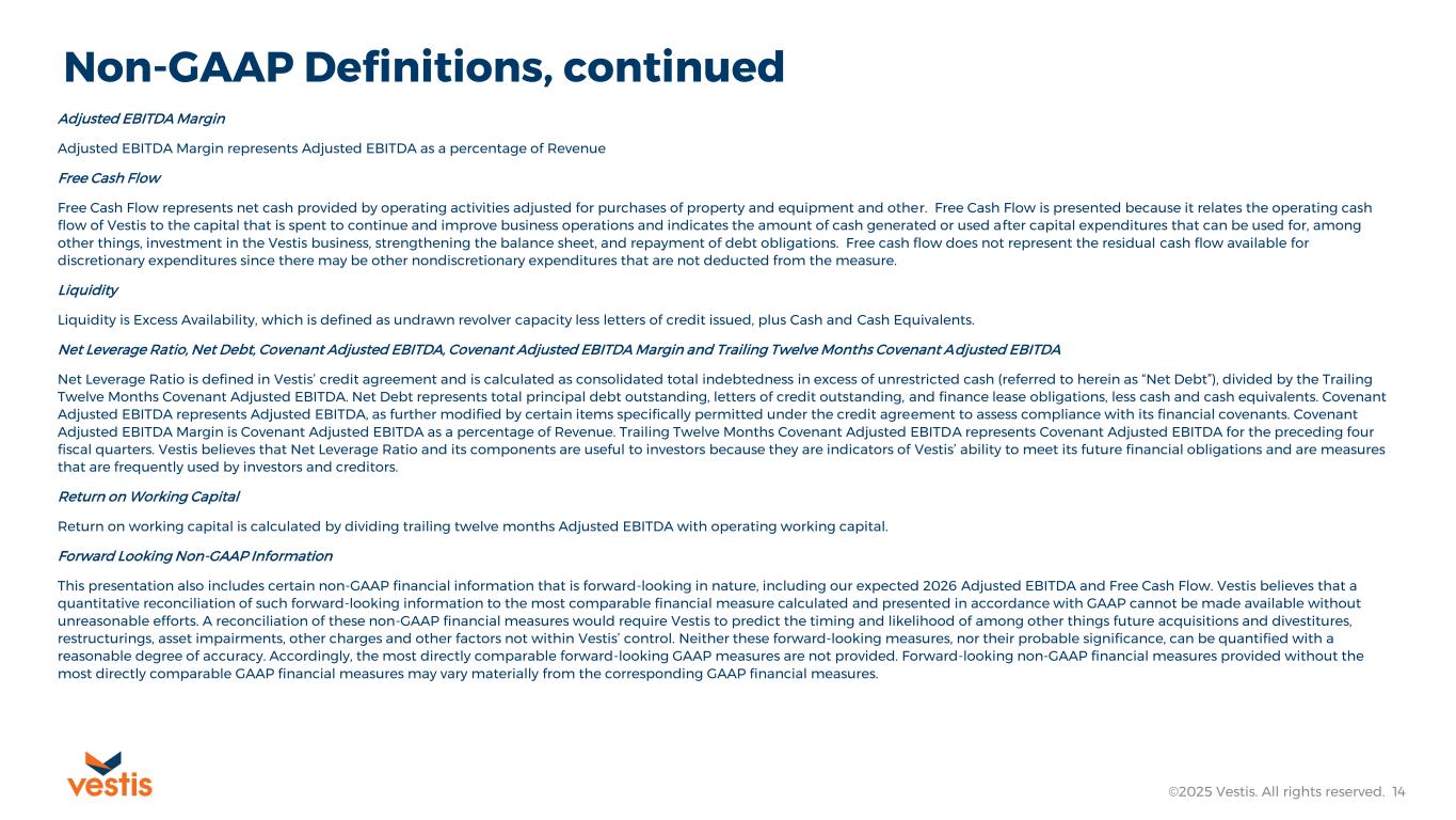 Non-GAAP Definitions ©2025 Vestis. All rights reserved. 13 Vestis reports its financial results in accordance with U.S. GAAP, but in this presentation and the non-GAAP reconciliations that follow, Vestis also uses the following non-GAAP measures: Normalized Revenue, Adjusted EPS, Adjusted Gross Profit, Adjusted Gross Margin, Adjusted EBITDA, Adjusted EBITDA Margin, Free Cash Flow, Liquidity, Net Debt, Net Leverage Ratio, Trailing Twelve Months Covenant Adjusted EBITDA, and Return on Working Capital. Vestis believes that non-GAAP financial measures, both together with and in addition to the corresponding U.S. GAAP financial measure, are important supplemental measures that exclude non-cash or other items that may not be indicative of or are unrelated to Vestis’ core operating results. Vestis uses these non-GAAP financial measures with U.S. GAAP financial measures and other comparable tools to assist in the evaluation of its operating performance. Vestis believes that presentation of these measures also helps investors because the measures enable better comparisons of Vestis’ historical results and allow investors to evaluate Vestis’ performance based on the same metrics that Vestis uses to evaluate its performance and trends in its results. However, these measures have limitations as analytical tools and should not be considered in isolation or as a substitute for Vestis’ results as reported under U.S. GAAP. Specifically, you should not consider these measures as alternatives to revenue, operating income, operating income margin, net income, net income margin or net cash provided by operating activities determined in accordance with U.S. GAAP. These non-GAAP financial measures also should not be considered as measures of cash available to Vestis to invest in the growth of Vestis’ business or cash that will be available to Vestis to meet its obligations. Non-GAAP financial measures as presented by Vestis may not be comparable to other similarly titled measures of other companies because not all companies use identical calculations. These non-GAAP measures are reconciled in the tables at the end of this presentation. Normalized Revenue Normalized Revenue removes the impact of the 53rd week in fiscal 2025 to facilitate comparability with prior 52-week years and prior 13-week quarters. Normalized Revenue is calculated by taking reported revenue and subtracting the estimated revenue associated with the additional operating week. The estimated one-week revenue impact is determined by dividing total reported revenue by 53 weeks to derive an average weekly revenue amount. Adjusted EPS Adjusted EPS represents Net Income or Loss adjusted for share-based compensation expense; severance; separation related charges; securitization fees; loss (gain) on sale of equity investment; third party debt amendment fees; legal reserves and settlements; gains, losses, and other items impacting comparability divided by basic and diluted weighted average shares outstanding. Adjusted Gross Profit Adjusted Gross Profit is defined as Total Revenue minus Cost of Services Provided (exclusive of depreciation and amortization). Adjusted Gross Margin Adjusted Gross Profit Margin is defined as Adjusted Gross Profit divided by Total Revenue. Adjusted EBITDA Adjusted EBITDA represents net income adjusted for provision for income taxes; interest expense, net; and depreciation and amortization (EBITDA), further adjusted for share-based compensation expense; severance; separation related charges; securitization fees; loss (gain) on sale of equity investment; third party debt amendment fees; legal reserves and settlements; gains, losses, and other items impacting comparability. Adjusted EBITDA is presented in order to reflect Vestis’ results in a manner that allows a better understanding of operational activities separate from the financial impact of decisions made for the long-term benefit of Vestis and other items impacting comparability between periods. Similar adjustments have been recorded in Adjusted EBITDA for earlier periods and similar types of adjustments can reasonably be expected to be recorded in Adjusted EBITDA in future periods.