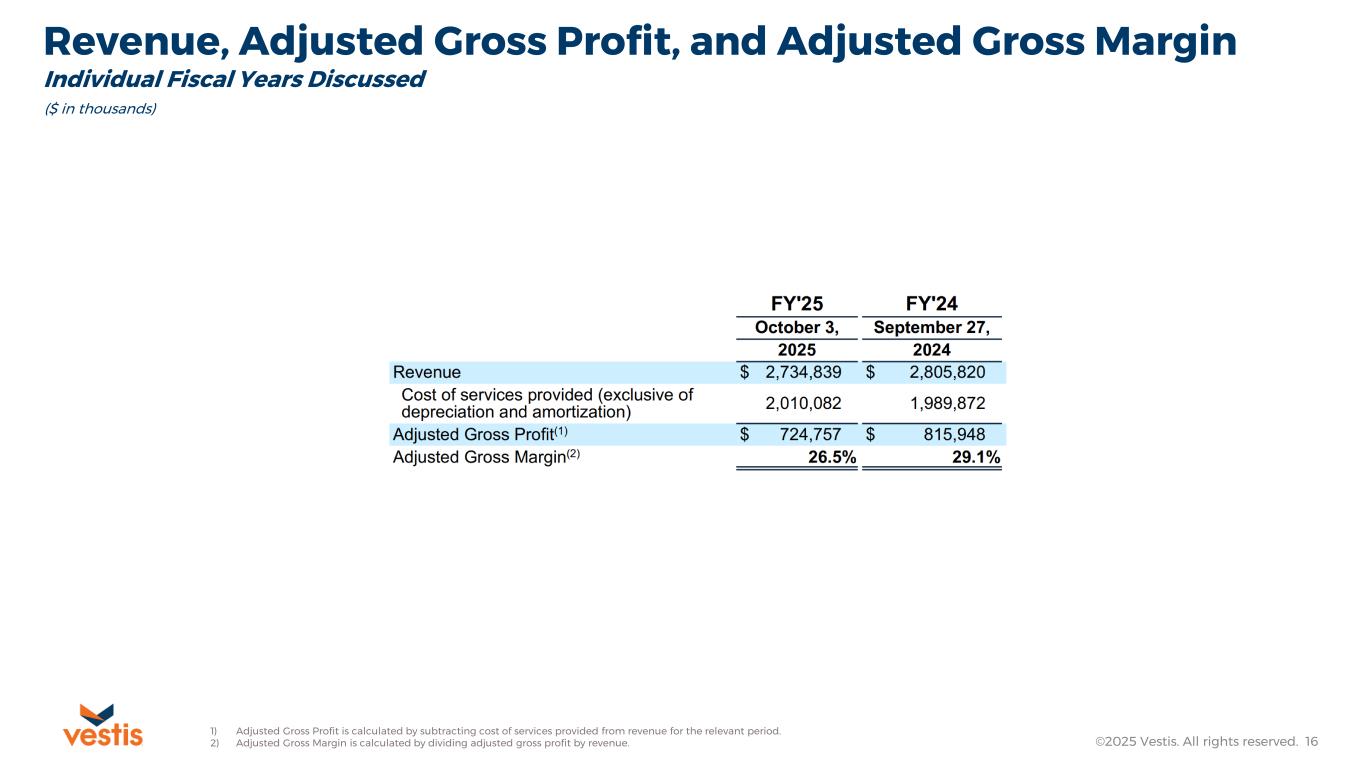 Revenue, Adjusted Gross Profit, and Adjusted Gross Margin Individual Fiscal Quarters Discussed ©2025 Vestis. All rights reserved. 15 ($ in thousands) 1) Adjusted Gross Profit is calculated by subtracting cost of services provided from revenue for the relevant period. 2) Adjusted Gross Margin is calculated by dividing adjusted gross profit by revenue.