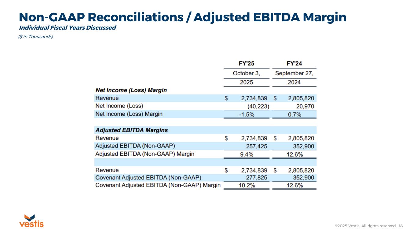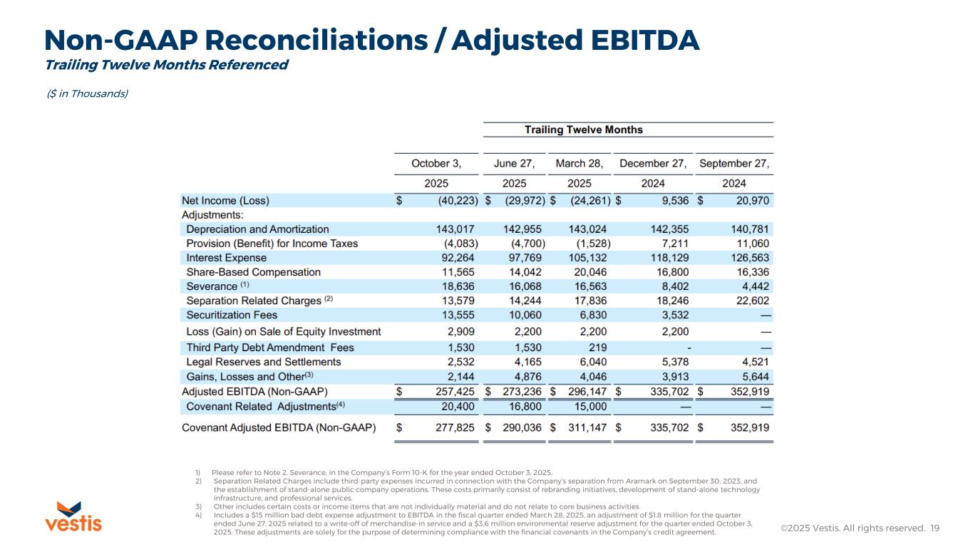 Non-GAAP Reconciliations / Adjusted EBITDA ©2025 Vestis. All rights reserved. 17 ($ in Thousands) 1) Please refer to Note 2. Severance, in the Company’s Form 10-K for the year ended October 3, 2025. 2) Separation Related Charges include third-party expenses incurred in connection with the Company’s separation from Aramark on September 30, 2023, and the establishment of stand-alone public company operations. These costs primarily consist of rebranding initiatives, development of stand-alone technology infrastructure, and professional services. 3) Other includes certain costs or income items that are not individually material and do not relate to core business activities. 4) Includes a $15 million bad debt expense adjustment to EBITDA in the fiscal quarter ended March 28, 2025, an adjustment of $1.8 million for the quarter ended June 27, 2025 related to a write-off of merchandise-in service and a $3.6 million environmental reserve adjustment for the quarter ended October 3, 2025. These adjustments are solely for the purpose of determining compliance with the financial covenants in the Company’s credit agreement. Individual Fiscal Quarters Referenced