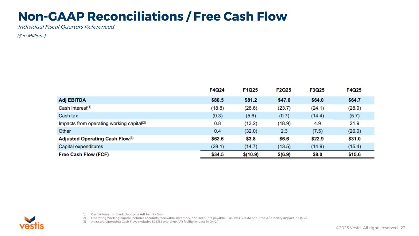 Non-GAAP Reconciliations / Free Cash Flow ©2025 Vestis. All rights reserved. 24 ($ in Millions) 1) Cash interest on bank debt plus A/R facility fees 2) Operating working capital includes accounts receivable, inventory, and accounts payable. Excludes $233M one-time A/R facility impact in Q4-24 3) Adjusted Operating Cash Flow excludes $233M one-time A/R facility impact in Q4-24 Individual Fiscal Years Referenced