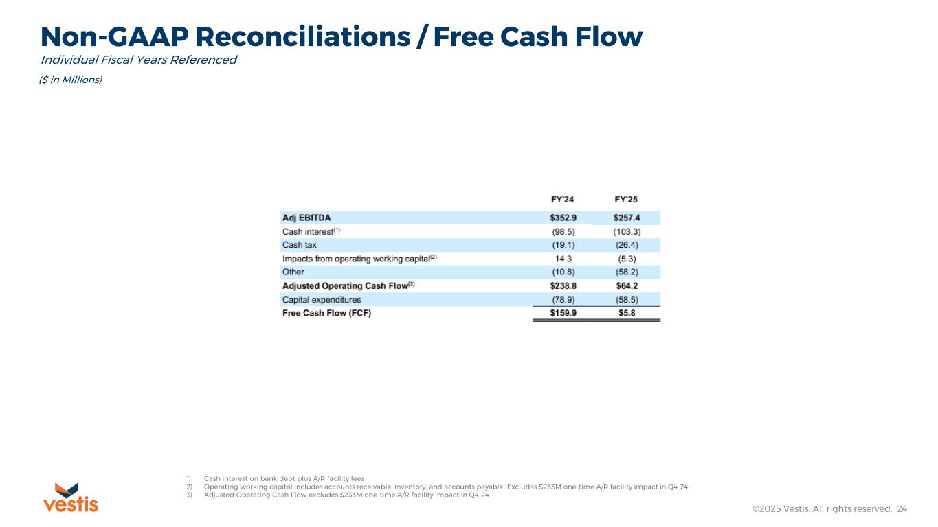 Non-GAAP Reconciliations / Free Cash Flow ©2025 Vestis. All rights reserved. 23 ($ in Millions) 1) Cash interest on bank debt plus A/R facility fees 2) Operating working capital includes accounts receivable, inventory, and accounts payable. Excludes $233M one-time A/R facility impact in Q4-24 3) Adjusted Operating Cash Flow excludes $233M one-time A/R facility impact in Q4-24 Individual Fiscal Quarters Referenced
