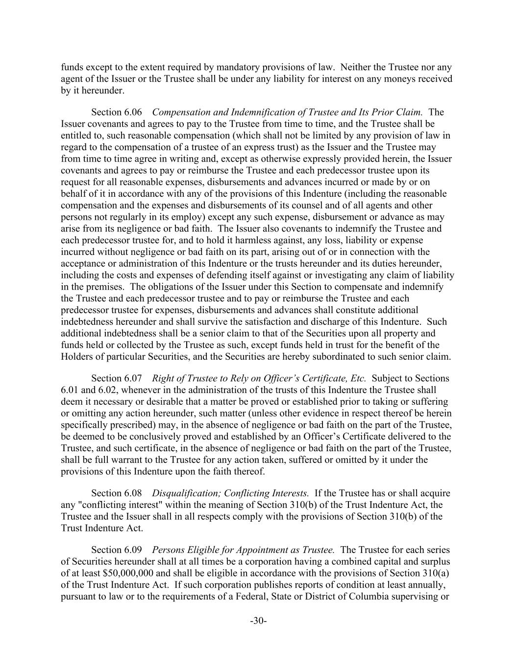 -30- funds except to the extent required by mandatory provisions of law. Neither the Trustee nor any agent of the Issuer or the Trustee shall be under any liability for interest on any moneys received by it hereunder. Section 6.06 Compensation and Indemnification of Trustee and Its Prior Claim. The Issuer covenants and agrees to pay to the Trustee from time to time, and the Trustee shall be entitled to, such reasonable compensation (which shall not be limited by any provision of law in regard to the compensation of a trustee of an express trust) as the Issuer and the Trustee may from time to time agree in writing and, except as otherwise expressly provided herein, the Issuer covenants and agrees to pay or reimburse the Trustee and each predecessor trustee upon its request for all reasonable expenses, disbursements and advances incurred or made by or on behalf of it in accordance with any of the provisions of this Indenture (including the reasonable compensation and the expenses and disbursements of its counsel and of all agents and other persons not regularly in its employ) except any such expense, disbursement or advance as may arise from its negligence or bad faith. The Issuer also covenants to indemnify the Trustee and each predecessor trustee for, and to hold it harmless against, any loss, liability or expense incurred without negligence or bad faith on its part, arising out of or in connection with the acceptance or administration of this Indenture or the trusts hereunder and its duties hereunder, including the costs and expenses of defending itself against or investigating any claim of liability in the premises. The obligations of the Issuer under this Section to compensate and indemnify the Trustee and each predecessor trustee and to pay or reimburse the Trustee and each predecessor trustee for expenses, disbursements and advances shall constitute additional indebtedness hereunder and shall survive the satisfaction and discharge of this Indenture. Such additional indebtedness shall be a senior claim to that of the Securities upon all property and funds held or collected by the Trustee as such, except funds held in trust for the benefit of the Holders of particular Securities, and the Securities are hereby subordinated to such senior claim. Section 6.07 Right of Trustee to Rely on Officer’s Certificate, Etc. Subject to Sections 6.01 and 6.02, whenever in the administration of the trusts of this Indenture the Trustee shall deem it necessary or desirable that a matter be proved or established prior to taking or suffering or omitting any action hereunder, such matter (unless other evidence in respect thereof be herein specifically prescribed) may, in the absence of negligence or bad faith on the part of the Trustee, be deemed to be conclusively proved and established by an Officer’s Certificate delivered to the Trustee, and such certificate, in the absence of negligence or bad faith on the part of the Trustee, shall be full warrant to the Trustee for any action taken, suffered or omitted by it under the provisions of this Indenture upon the faith thereof. Section 6.08 Disqualification; Conflicting Interests. If the Trustee has or shall acquire any "conflicting interest" within the meaning of Section 310(b) of the Trust Indenture Act, the Trustee and the Issuer shall in all respects comply with the provisions of Section 310(b) of the Trust Indenture Act. Section 6.09 Persons Eligible for Appointment as Trustee. The Trustee for each series of Securities hereunder shall at all times be a corporation having a combined capital and surplus of at least $50,000,000 and shall be eligible in accordance with the provisions of Section 310(a) of the Trust Indenture Act. If such corporation publishes reports of condition at least annually, pursuant to law or to the requirements of a Federal, State or District of Columbia supervising or