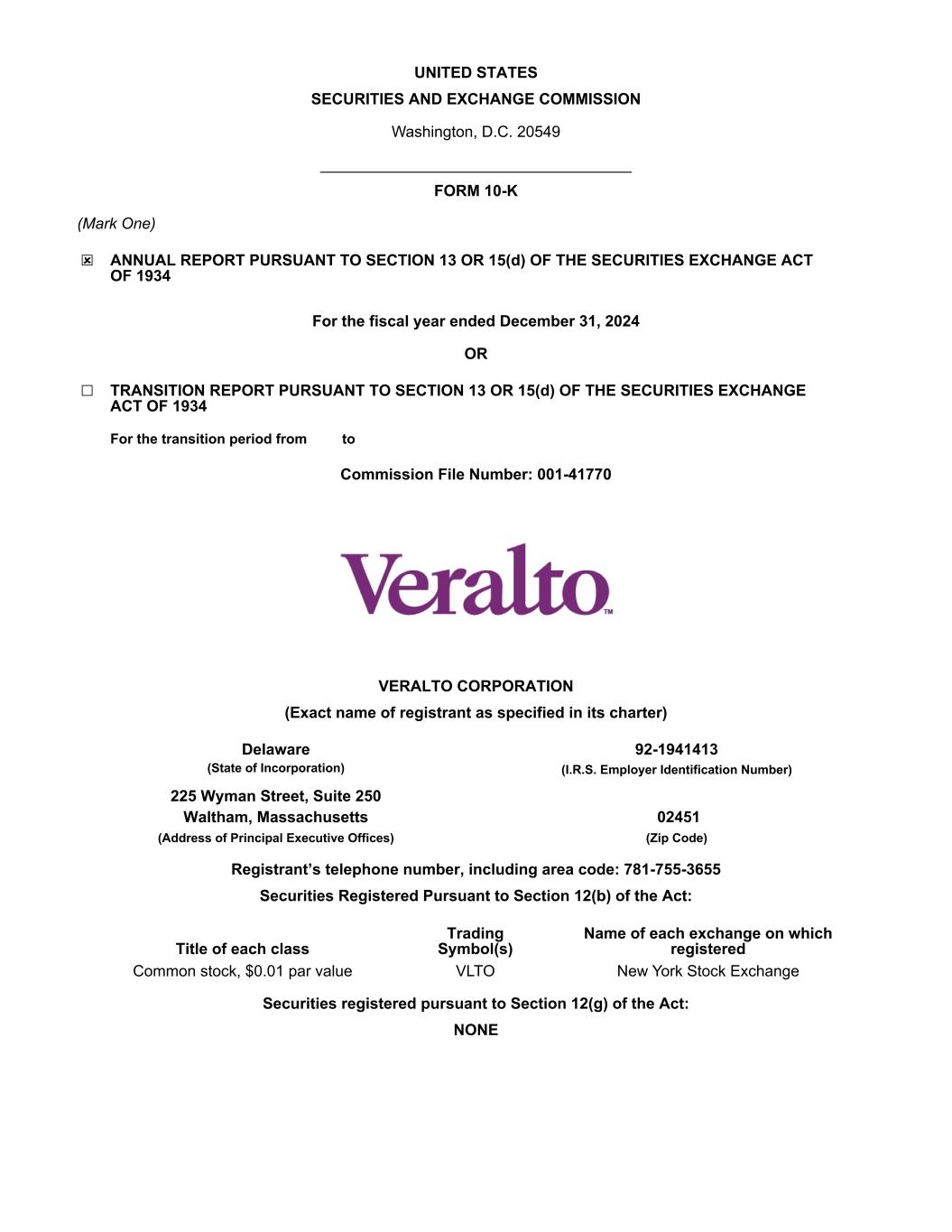 UNITED STATES SECURITIES AND EXCHANGE COMMISSION Washington, D.C. 20549 ____________________________________ FORM 10-K (Mark One) ☒ ANNUAL REPORT PURSUANT TO SECTION 13 OR 15(d) OF THE SECURITIES EXCHANGE ACT OF 1934 For the fiscal year ended December 31, 2024 OR ☐ TRANSITION REPORT PURSUANT TO SECTION 13 OR 15(d) OF THE SECURITIES EXCHANGE ACT OF 1934 For the transition period from to Commission File Number: 001-41770 VERALTO CORPORATION (Exact name of registrant as specified in its charter) Delaware 92-1941413 (State of Incorporation) (I.R.S. Employer Identification Number) 225 Wyman Street, Suite 250 Waltham, Massachusetts 02451 (Address of Principal Executive Offices) (Zip Code) Registrant’s telephone number, including area code: 781-755-3655 Securities Registered Pursuant to Section 12(b) of the Act: Title of each class Trading Symbol(s) Name of each exchange on which registered Common stock, $0.01 par value VLTO New York Stock Exchange Securities registered pursuant to Section 12(g) of the Act: NONE