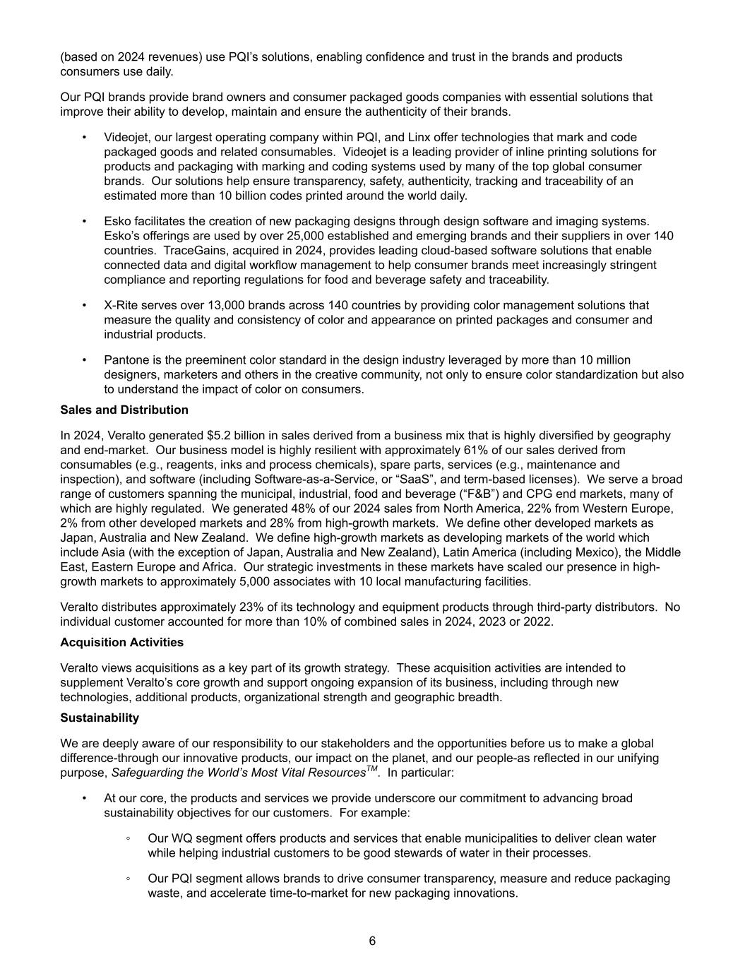 (based on 2024 revenues) use PQI’s solutions, enabling confidence and trust in the brands and products consumers use daily. Our PQI brands provide brand owners and consumer packaged goods companies with essential solutions that improve their ability to develop, maintain and ensure the authenticity of their brands. • Videojet, our largest operating company within PQI, and Linx offer technologies that mark and code packaged goods and related consumables. Videojet is a leading provider of inline printing solutions for products and packaging with marking and coding systems used by many of the top global consumer brands. Our solutions help ensure transparency, safety, authenticity, tracking and traceability of an estimated more than 10 billion codes printed around the world daily. • Esko facilitates the creation of new packaging designs through design software and imaging systems. Esko’s offerings are used by over 25,000 established and emerging brands and their suppliers in over 140 countries. TraceGains, acquired in 2024, provides leading cloud-based software solutions that enable connected data and digital workflow management to help consumer brands meet increasingly stringent compliance and reporting regulations for food and beverage safety and traceability. • X-Rite serves over 13,000 brands across 140 countries by providing color management solutions that measure the quality and consistency of color and appearance on printed packages and consumer and industrial products. • Pantone is the preeminent color standard in the design industry leveraged by more than 10 million designers, marketers and others in the creative community, not only to ensure color standardization but also to understand the impact of color on consumers. Sales and Distribution In 2024, Veralto generated $5.2 billion in sales derived from a business mix that is highly diversified by geography and end-market. Our business model is highly resilient with approximately 61% of our sales derived from consumables (e.g., reagents, inks and process chemicals), spare parts, services (e.g., maintenance and inspection), and software (including Software-as-a-Service, or “SaaS”, and term-based licenses). We serve a broad range of customers spanning the municipal, industrial, food and beverage (“F&B”) and CPG end markets, many of which are highly regulated. We generated 48% of our 2024 sales from North America, 22% from Western Europe, 2% from other developed markets and 28% from high-growth markets. We define other developed markets as Japan, Australia and New Zealand. We define high-growth markets as developing markets of the world which include Asia (with the exception of Japan, Australia and New Zealand), Latin America (including Mexico), the Middle East, Eastern Europe and Africa. Our strategic investments in these markets have scaled our presence in high- growth markets to approximately 5,000 associates with 10 local manufacturing facilities. Veralto distributes approximately 23% of its technology and equipment products through third-party distributors. No individual customer accounted for more than 10% of combined sales in 2024, 2023 or 2022. Acquisition Activities Veralto views acquisitions as a key part of its growth strategy. These acquisition activities are intended to supplement Veralto’s core growth and support ongoing expansion of its business, including through new technologies, additional products, organizational strength and geographic breadth. Sustainability We are deeply aware of our responsibility to our stakeholders and the opportunities before us to make a global difference-through our innovative products, our impact on the planet, and our people-as reflected in our unifying purpose, Safeguarding the World’s Most Vital ResourcesTM. In particular: • At our core, the products and services we provide underscore our commitment to advancing broad sustainability objectives for our customers. For example: ◦ Our WQ segment offers products and services that enable municipalities to deliver clean water while helping industrial customers to be good stewards of water in their processes. ◦ Our PQI segment allows brands to drive consumer transparency, measure and reduce packaging waste, and accelerate time-to-market for new packaging innovations. 6