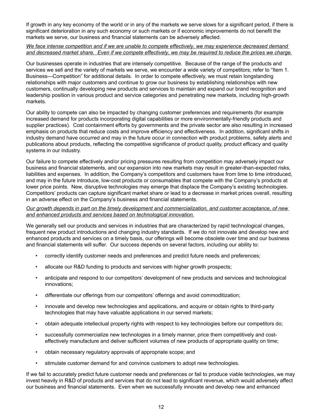 If growth in any key economy of the world or in any of the markets we serve slows for a significant period, if there is significant deterioration in any such economy or such markets or if economic improvements do not benefit the markets we serve, our business and financial statements can be adversely affected. We face intense competition and if we are unable to compete effectively, we may experience decreased demand and decreased market share. Even if we compete effectively, we may be required to reduce the prices we charge. Our businesses operate in industries that are intensely competitive. Because of the range of the products and services we sell and the variety of markets we serve, we encounter a wide variety of competitors; refer to “Item 1. Business—Competition” for additional details. In order to compete effectively, we must retain longstanding relationships with major customers and continue to grow our business by establishing relationships with new customers, continually developing new products and services to maintain and expand our brand recognition and leadership position in various product and service categories and penetrating new markets, including high-growth markets. Our ability to compete can also be impacted by changing customer preferences and requirements (for example increased demand for products incorporating digital capabilities or more environmentally-friendly products and supplier practices). Cost containment efforts by governments and the private sector are also resulting in increased emphasis on products that reduce costs and improve efficiency and effectiveness. In addition, significant shifts in industry demand have occurred and may in the future occur in connection with product problems, safety alerts and publications about products, reflecting the competitive significance of product quality, product efficacy and quality systems in our industry. Our failure to compete effectively and/or pricing pressures resulting from competition may adversely impact our business and financial statements, and our expansion into new markets may result in greater-than-expected risks, liabilities and expenses. In addition, the Company’s competitors and customers have from time to time introduced, and may in the future introduce, low-cost products or consumables that compete with the Company’s products at lower price points. New, disruptive technologies may emerge that displace the Company’s existing technologies. Competitors’ products can capture significant market share or lead to a decrease in market prices overall, resulting in an adverse effect on the Company’s business and financial statements. Our growth depends in part on the timely development and commercialization, and customer acceptance, of new and enhanced products and services based on technological innovation. We generally sell our products and services in industries that are characterized by rapid technological changes, frequent new product introductions and changing industry standards. If we do not innovate and develop new and enhanced products and services on a timely basis, our offerings will become obsolete over time and our business and financial statements will suffer. Our success depends on several factors, including our ability to: • correctly identify customer needs and preferences and predict future needs and preferences; • allocate our R&D funding to products and services with higher growth prospects; • anticipate and respond to our competitors’ development of new products and services and technological innovations; • differentiate our offerings from our competitors’ offerings and avoid commoditization; • innovate and develop new technologies and applications, and acquire or obtain rights to third-party technologies that may have valuable applications in our served markets; • obtain adequate intellectual property rights with respect to key technologies before our competitors do; • successfully commercialize new technologies in a timely manner, price them competitively and cost- effectively manufacture and deliver sufficient volumes of new products of appropriate quality on time; • obtain necessary regulatory approvals of appropriate scope; and • stimulate customer demand for and convince customers to adopt new technologies. If we fail to accurately predict future customer needs and preferences or fail to produce viable technologies, we may invest heavily in R&D of products and services that do not lead to significant revenue, which would adversely affect our business and financial statements. Even when we successfully innovate and develop new and enhanced 12