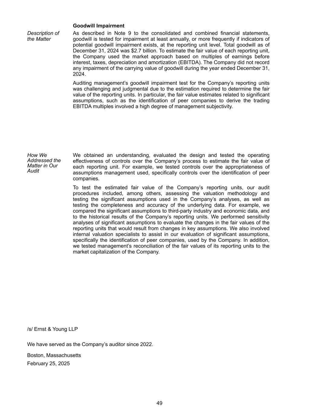 Goodwill Impairment Description of the Matter As described in Note 9 to the consolidated and combined financial statements, goodwill is tested for impairment at least annually, or more frequently if indicators of potential goodwill impairment exists, at the reporting unit level. Total goodwill as of December 31, 2024 was $2.7 billion. To estimate the fair value of each reporting unit, the Company used the market approach based on multiples of earnings before interest, taxes, depreciation and amortization (EBITDA). The Company did not record any impairment of the carrying value of goodwill during the year ended December 31, 2024. Auditing management’s goodwill impairment test for the Company’s reporting units was challenging and judgmental due to the estimation required to determine the fair value of the reporting units. In particular, the fair value estimates related to significant assumptions, such as the identification of peer companies to derive the trading EBITDA multiples involved a high degree of management subjectivity. How We Addressed the Matter in Our Audit We obtained an understanding, evaluated the design and tested the operating effectiveness of controls over the Company’s process to estimate the fair value of each reporting unit. For example, we tested controls over the appropriateness of assumptions management used, specifically controls over the identification of peer companies. To test the estimated fair value of the Company’s reporting units, our audit procedures included, among others, assessing the valuation methodology and testing the significant assumptions used in the Company’s analyses, as well as testing the completeness and accuracy of the underlying data. For example, we compared the significant assumptions to third-party industry and economic data, and to the historical results of the Company’s reporting units. We performed sensitivity analyses of significant assumptions to evaluate the changes in the fair values of the reporting units that would result from changes in key assumptions. We also involved internal valuation specialists to assist in our evaluation of significant assumptions, specifically the identification of peer companies, used by the Company. In addition, we tested management’s reconciliation of the fair values of its reporting units to the market capitalization of the Company. /s/ Ernst & Young LLP We have served as the Company’s auditor since 2022. Boston, Massachusetts February 25, 2025 49